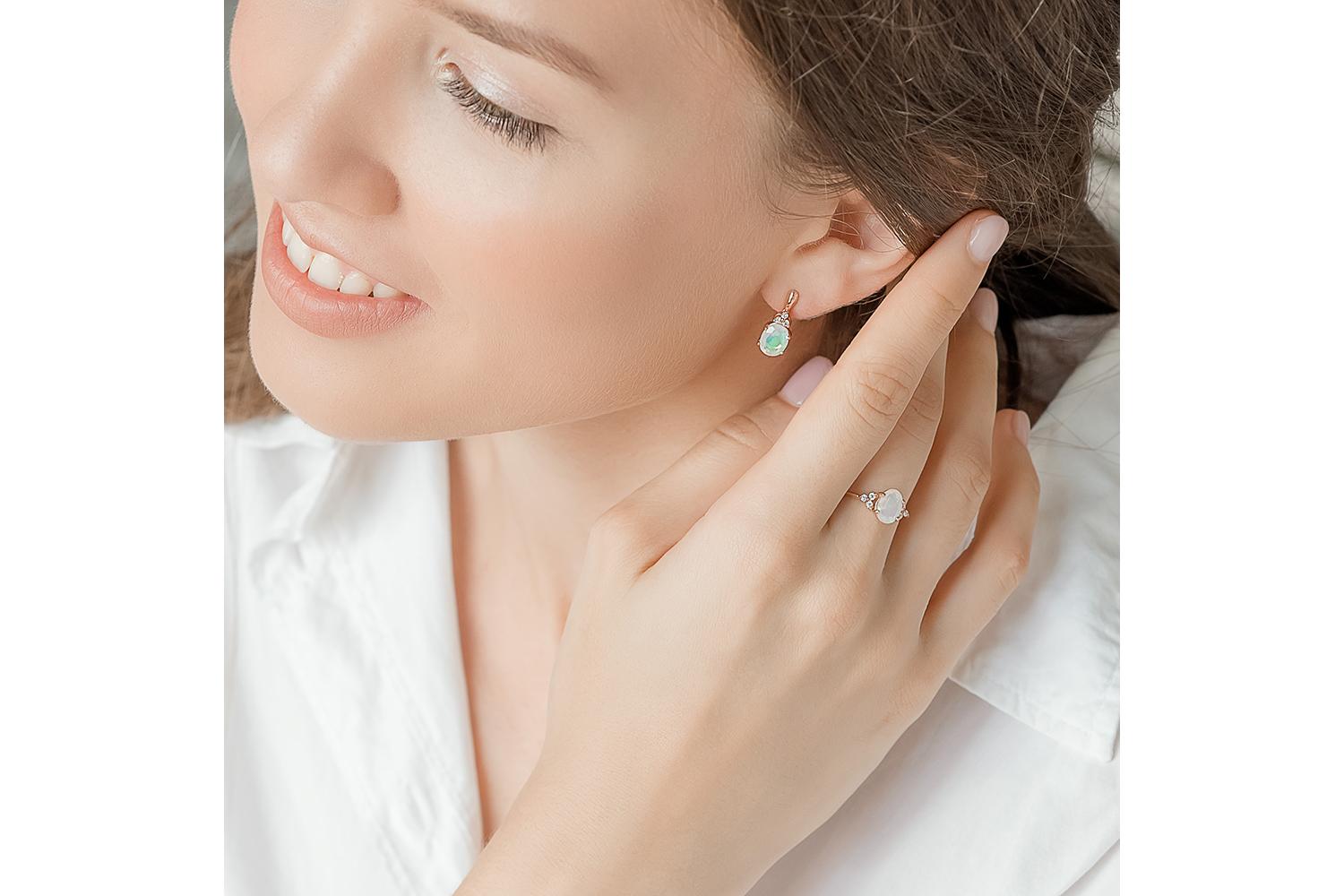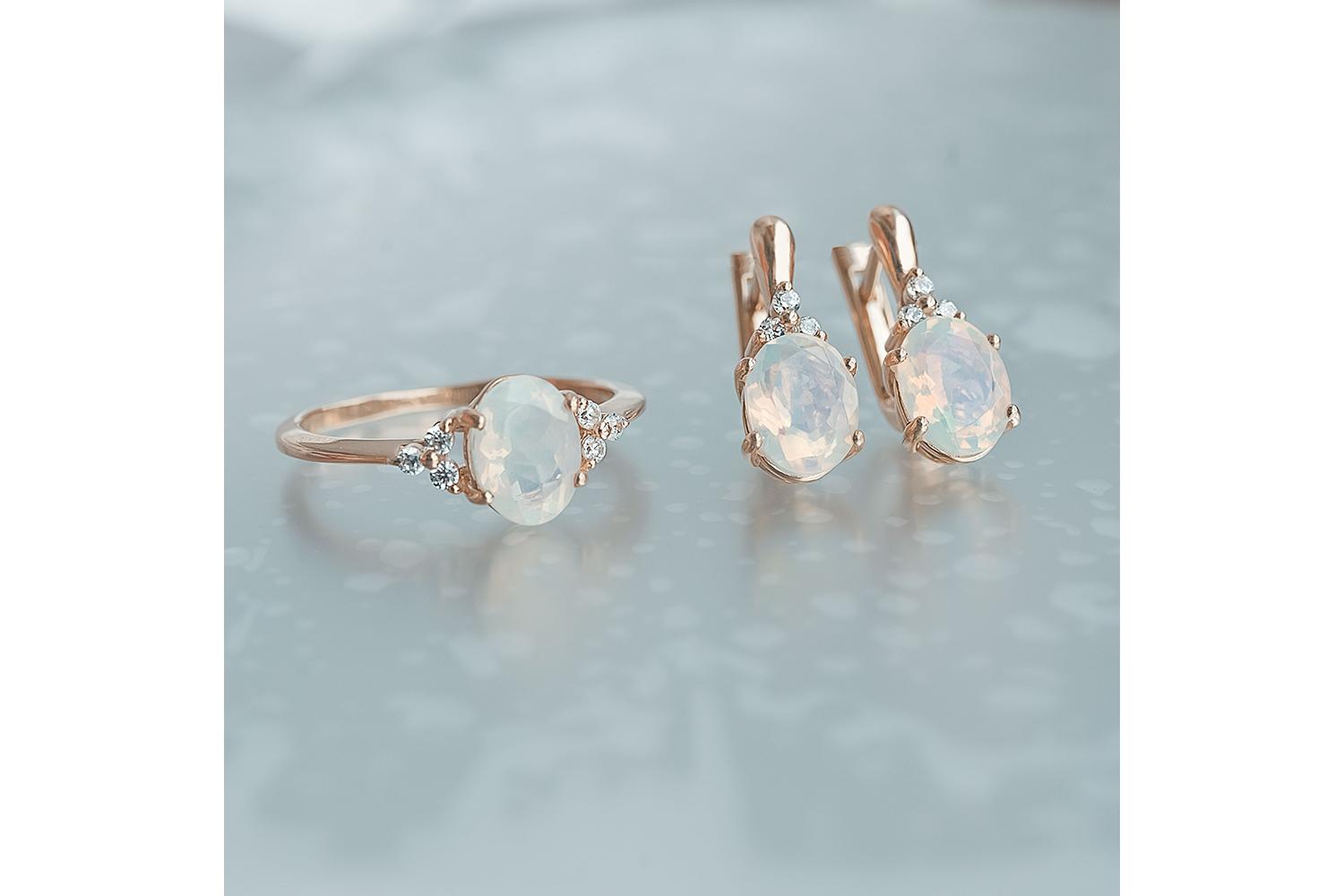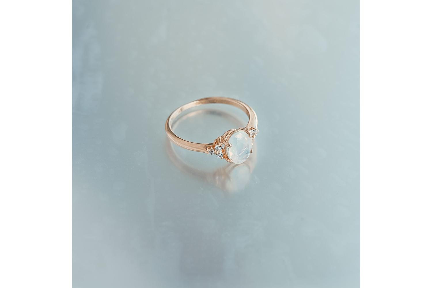 Перед нами изысканное ювелирное изделие - кольцо из красного золота с великолепным опаловым камнем: Благородный оттенок золота подчеркивает нежность и природную красоту центрального опала - переливающегося минерала с молочно-радужным сиянием. Округлой огранки камень выглядит мягко и женственно, будто светясь изнутри теплыми оттенками лимонно-зеленого спектра. По бокам от опала - три миниатюрных оранжевых сапфира, которые создают изящный акцент и подчеркивают общую цветовую гамму украшения. Их нежный персиковый оттенок гармонично контрастирует с золотой оправой.