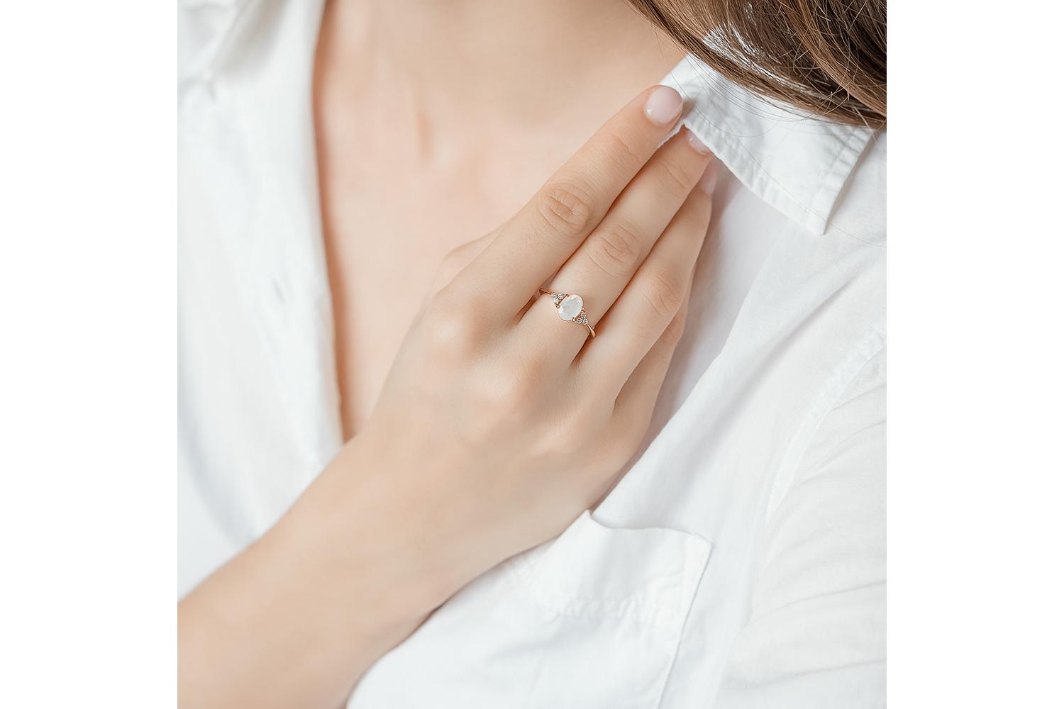 Утонченный дизайн кольца демонстрирует классическую элегантность - плавные линии, аккуратный размер камней, симметричное расположение декоративных элементов. Такое украшение символизирует изысканность и женственность, подходит для торжественных и повседневных образов.