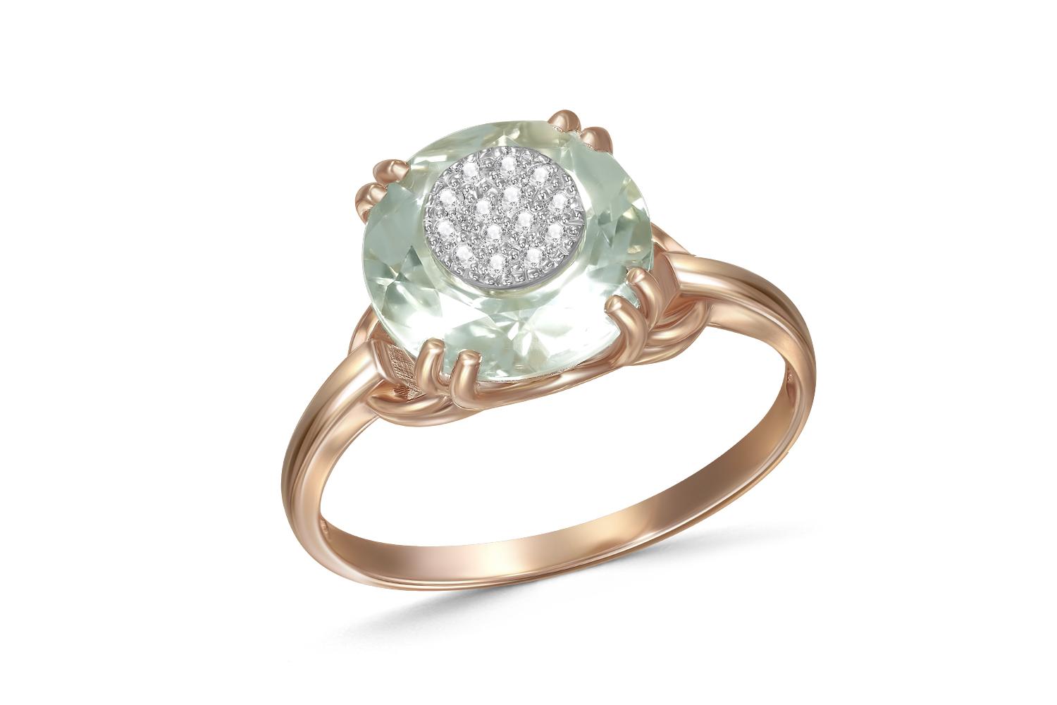 Аметист зеленый натуральный, количество 1 шт., огранка круг с отв., размер 10 мм ; Бриллиант, количество 14 шт., огранка Кр-57, размер 1 мм, цвет 4, чистота 5, вес 0,07 карат.