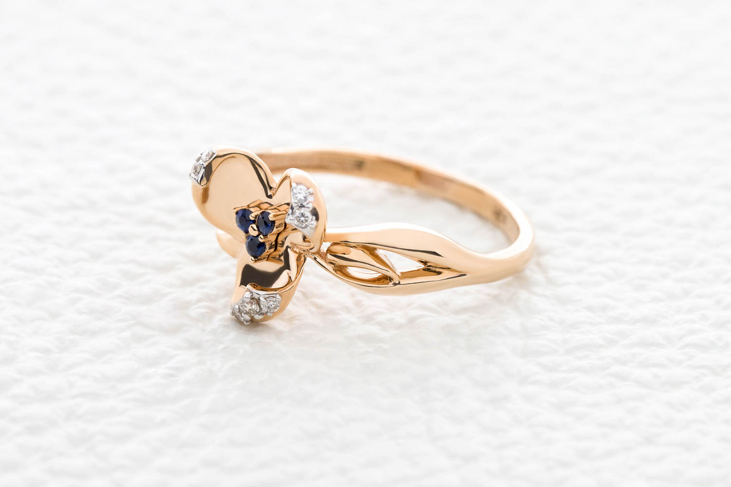 Мастера компании NEWGOLD, приложив всё свое мастерство и искусство, создали для Вас на нашем собственном производстве Кольцо Цветок из красного золота с 3 сапфирами и 7 бриллиантами.