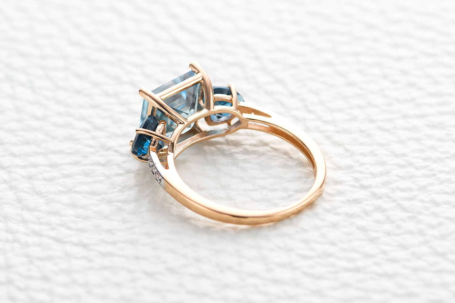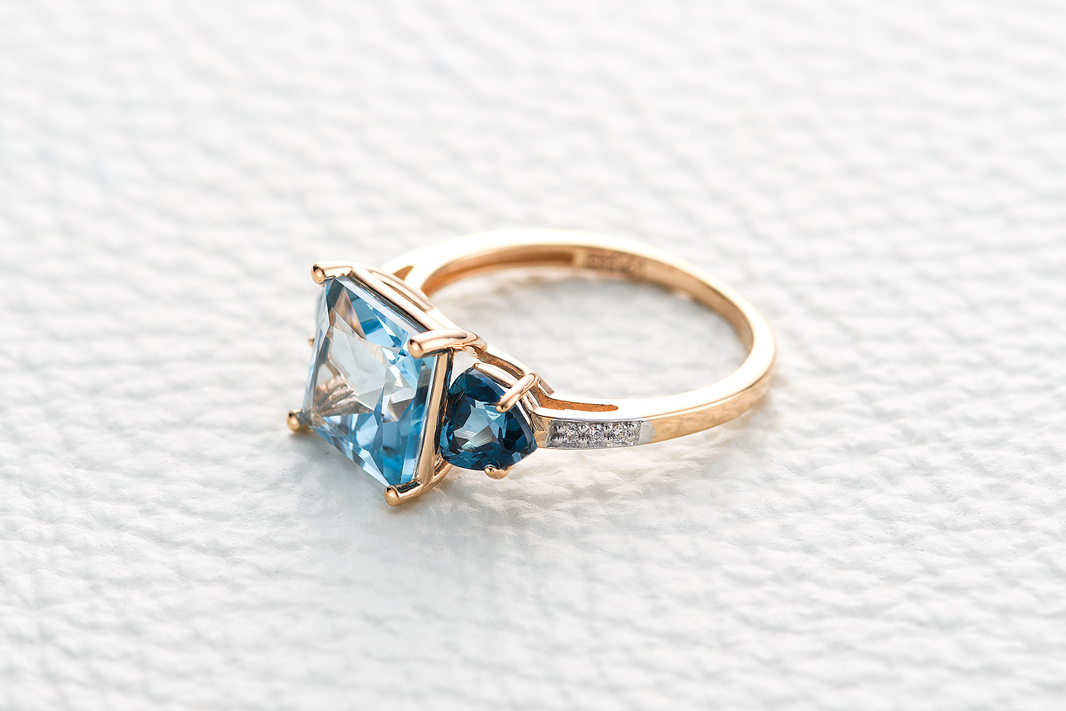 Мастера компании NEWGOLD, приложив всё свое мастерство и искусство, создали для Вас на нашем собственном производстве Кольцо из красного золота с 3 топазами sky и 6 фианитами.