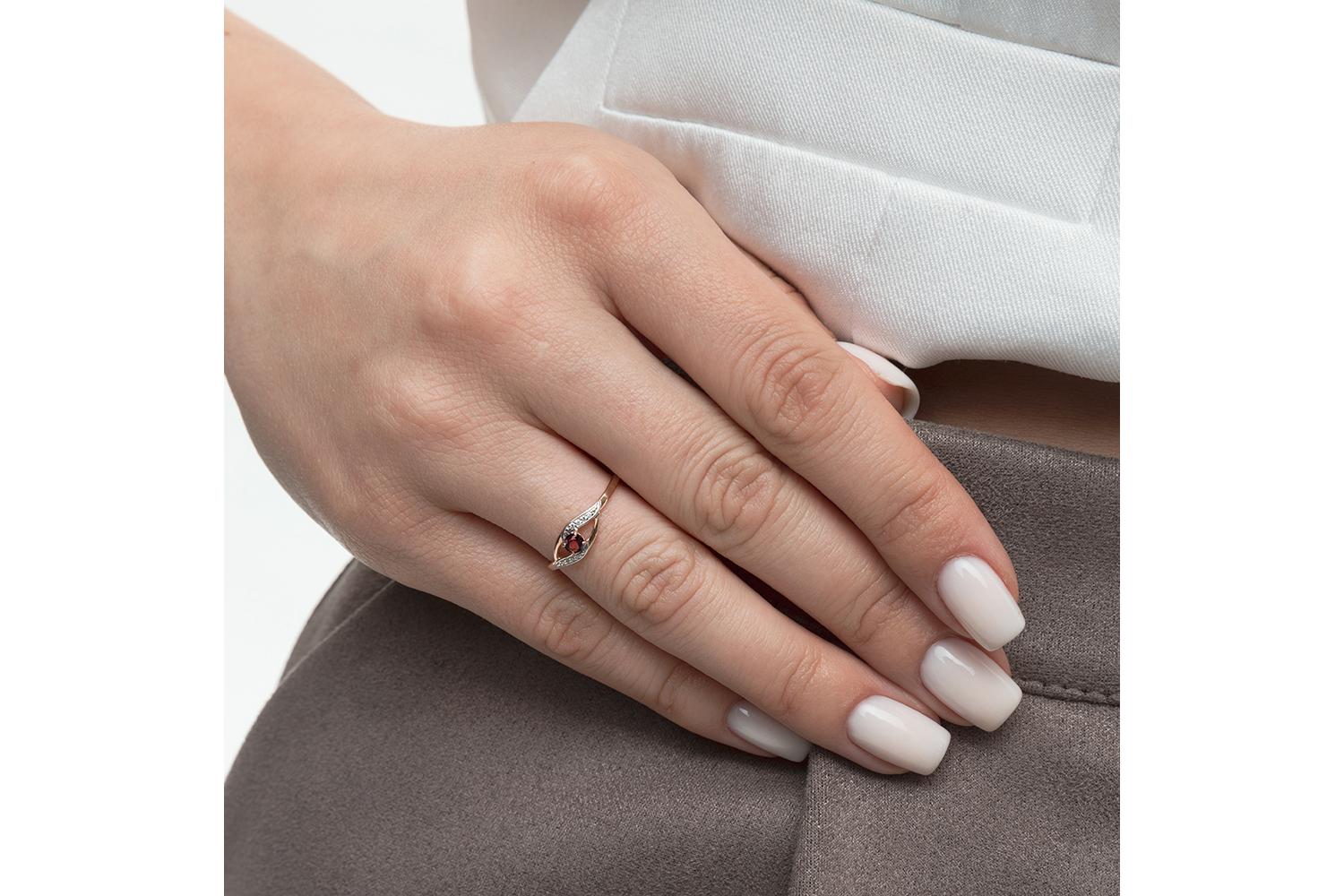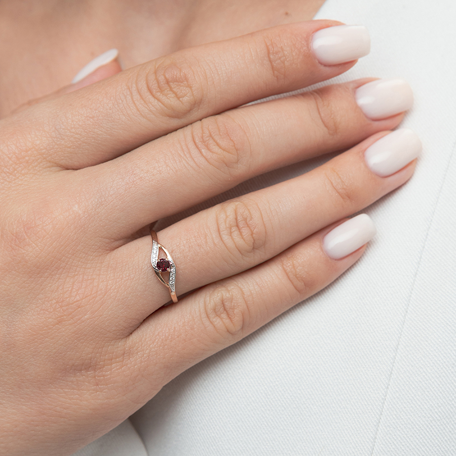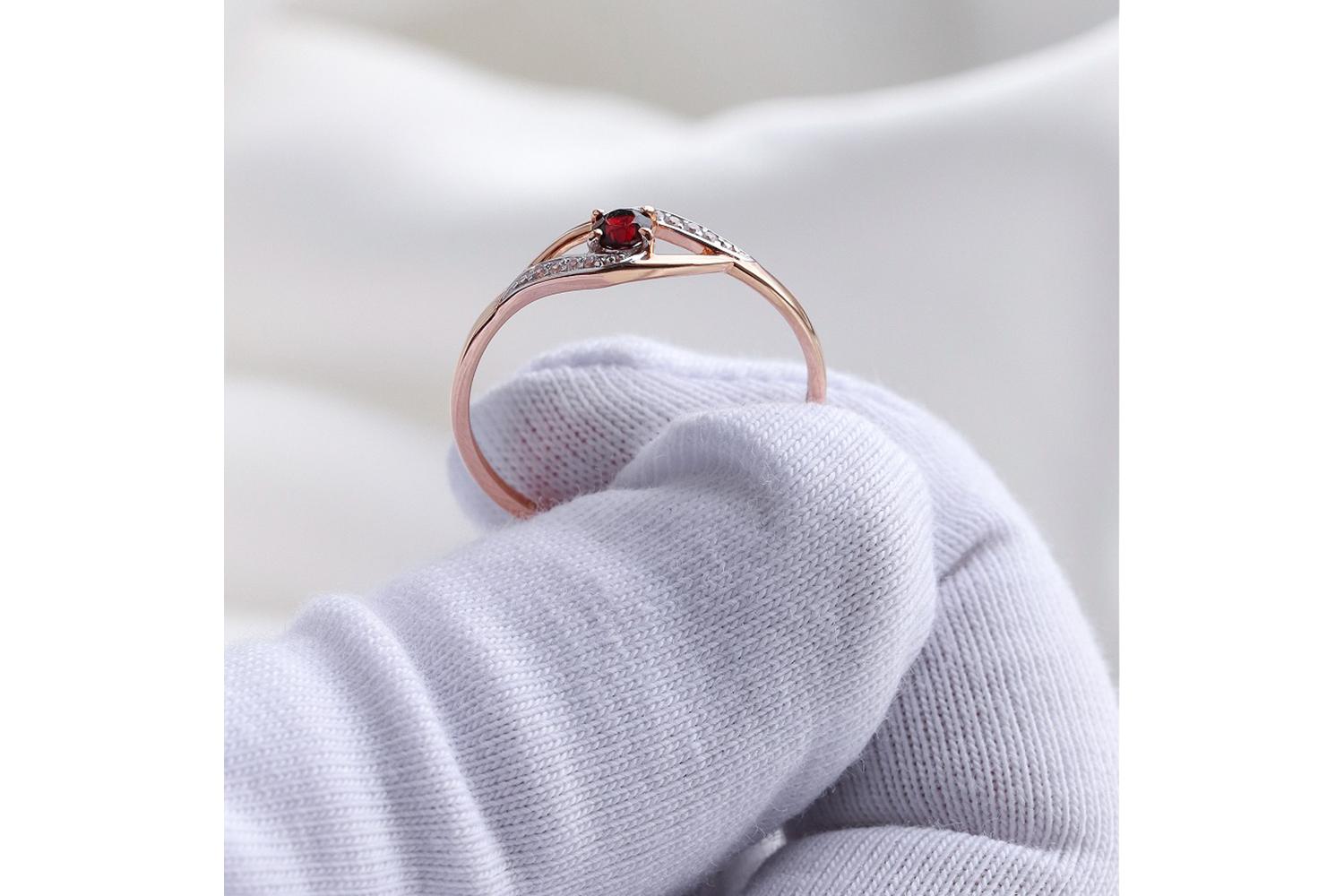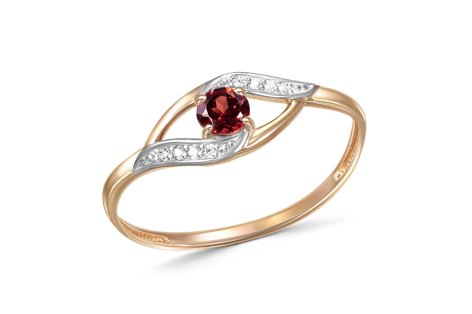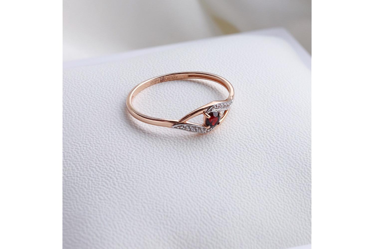 Закажите Кольцо из красного золота с гранатом и 8 фианитами с получением в Москве через курьерскую службу доставки напрямую с нашего производственного склада завода NEWGOLD!