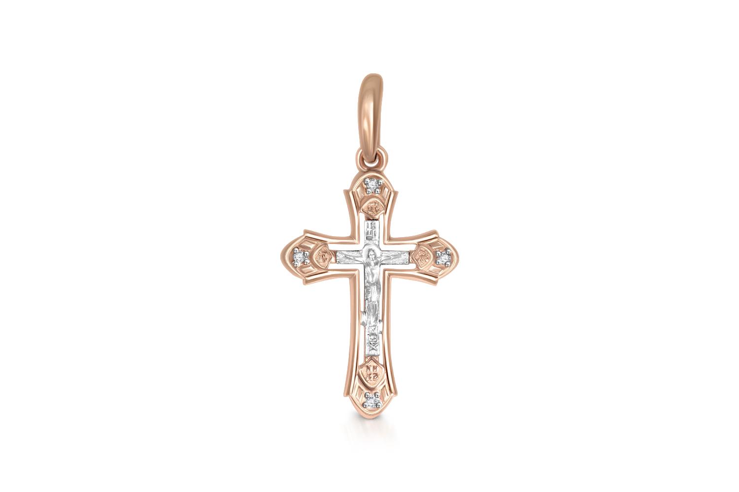 Металл: Золото, цвет: Красный/Белый , проба: 585. Вставки: Фианит б/цв, количество 4 шт. , огранка круг, размер 1 мм. " Крест православный нательный из комбинированного (красного и белого) золота 585 пробы бренда NEWGOLD.