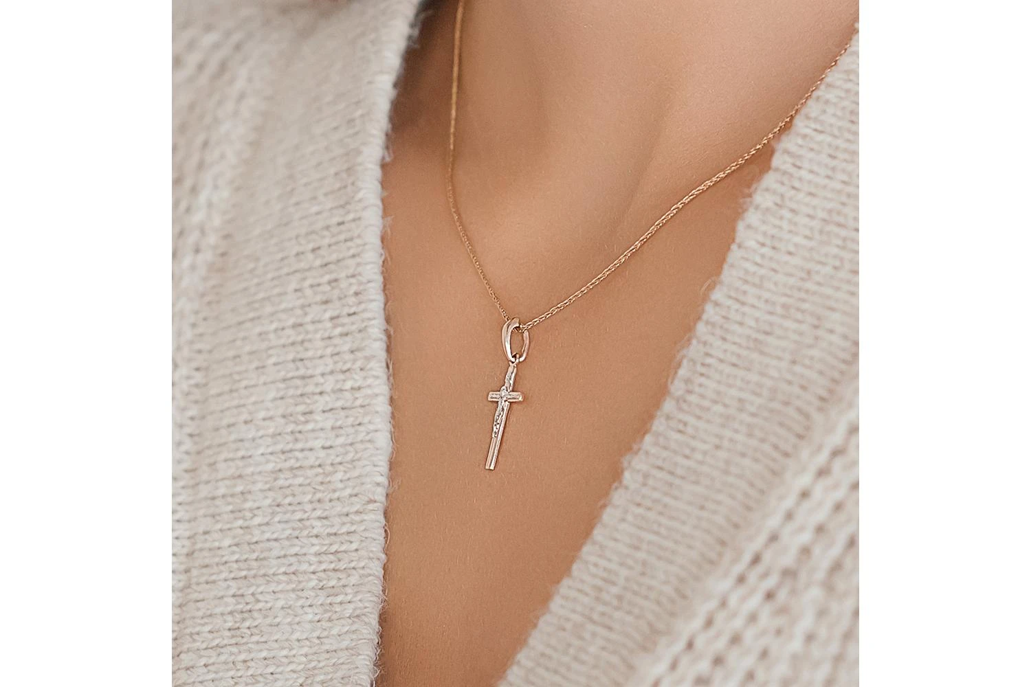 Подвес креста выглядит легким и воздушным, что свидетельствует о высоком мастерстве ювелира. Цветовое решение - золотисто-серебристое - универсально и подойдет к различным стилям одежды.