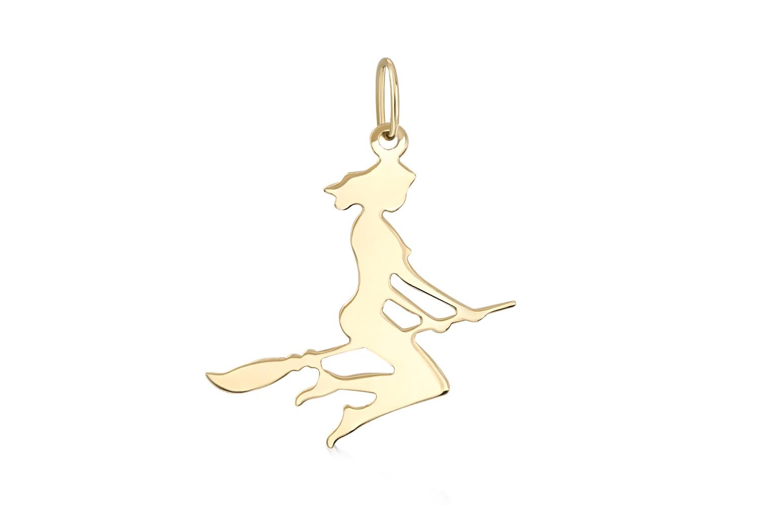 Изящная подвеска в форме стилизованного силуэта ведьмы на метле представляет собой элегантное ювелирное изделие из желтого золота. Минималистичный дизайн подчеркивает плавные линии и динамичную позу магического персонажа.