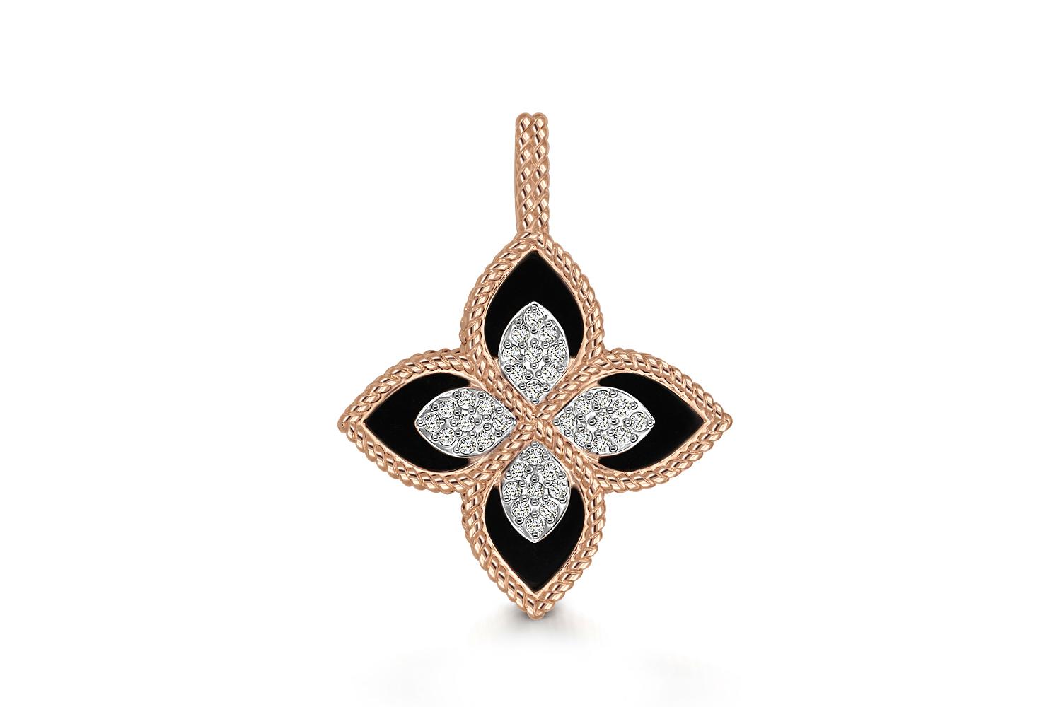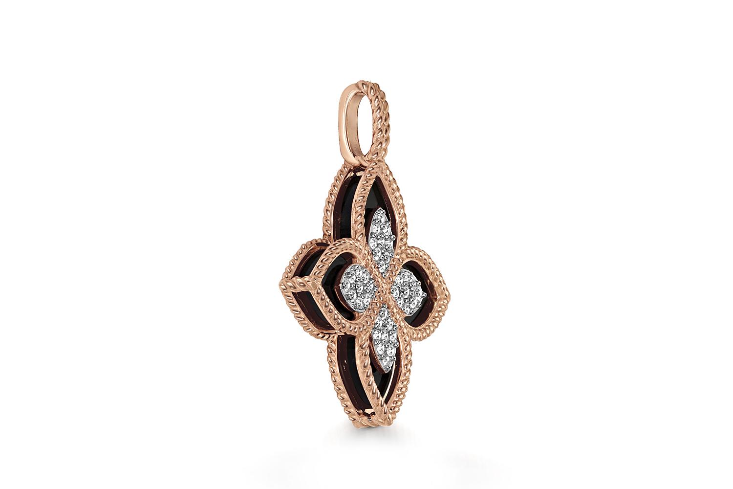 Мастера компании NEWGOLD, приложив всё свое мастерство и искусство, создали для Вас на нашем собственном производстве Подвеска Клевер из красного золота с ониксом и 36 фианитами.
