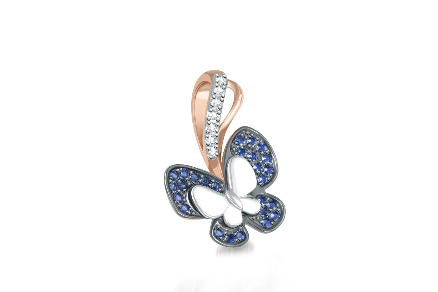 Мастера компании NEWGOLD, приложив всё свое мастерство и искусство, создали для Вас на нашем собственном производстве Подвеска Бабочка из красного золота с 7 бриллиантами и 26 сапфирами.