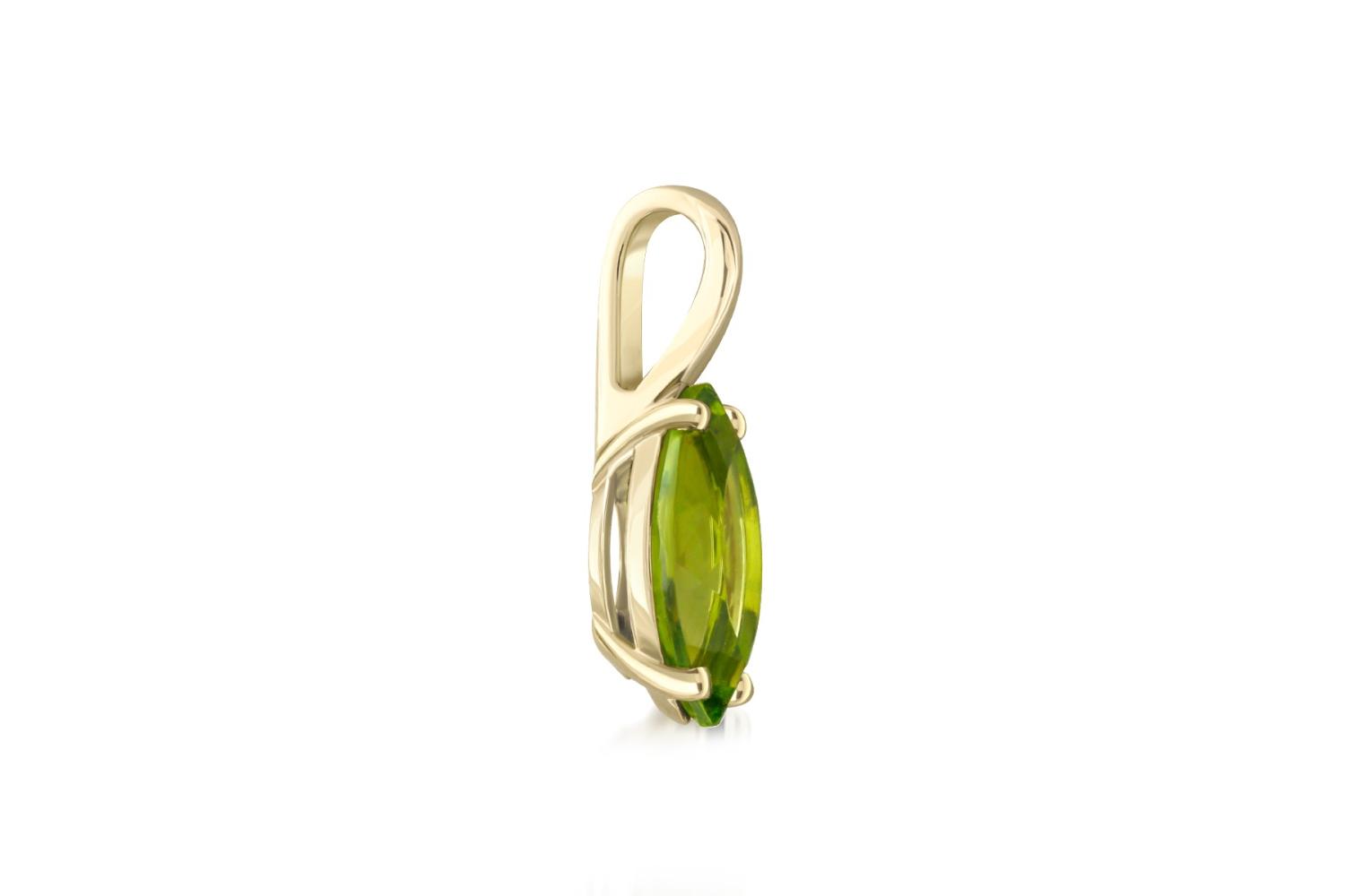 Изящная подвеска, выполненная в лаконичном дизайне, представляет собой драгоценное украшение с ярким хризолитом. Камень огранен в форме маркиза - удлиненного овала с заостренными концами, что подчеркивает его природную красоту. Насыщенный оливково-зеленый оттенок минерала плавно переливается, улавливая малейшие блики света.