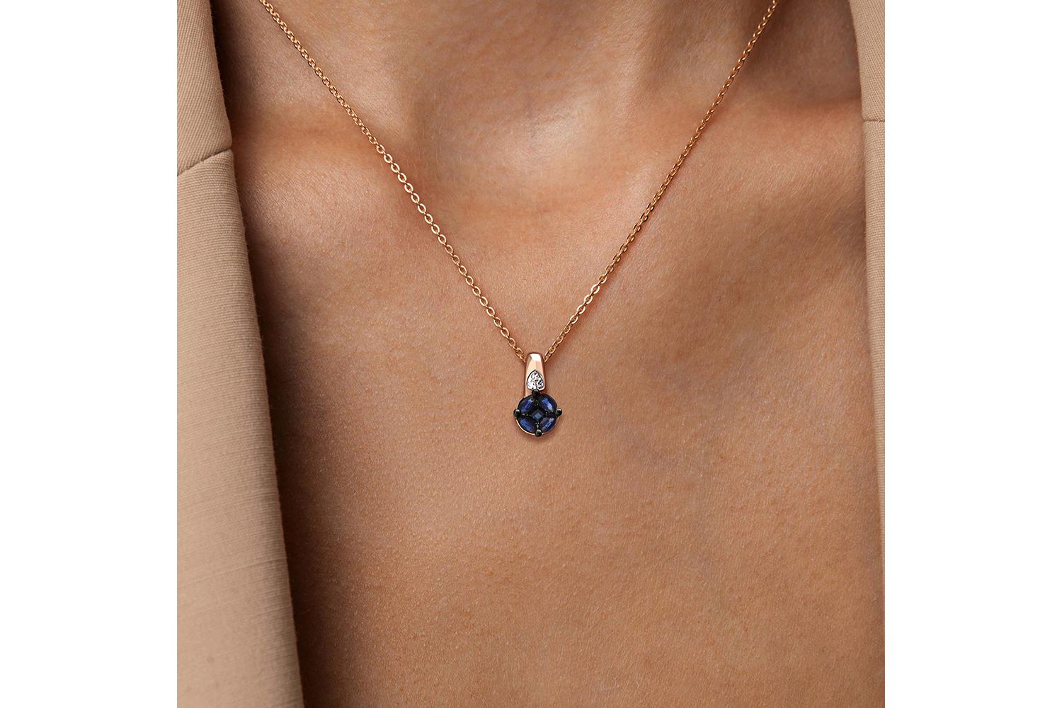Мастера компании NEWGOLD, приложив всё свое мастерство и искусство, создали для Вас на нашем собственном производстве Подвеска из красного золота с 5 сапфирами и 3 бриллиантами.