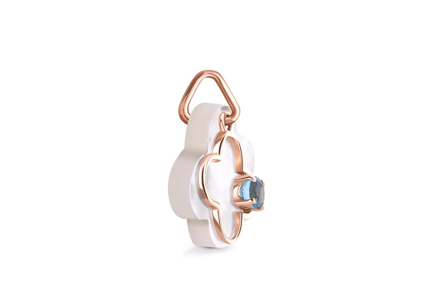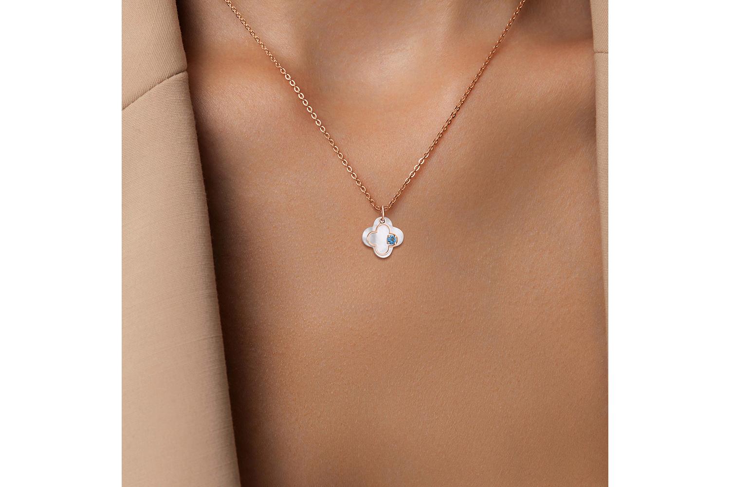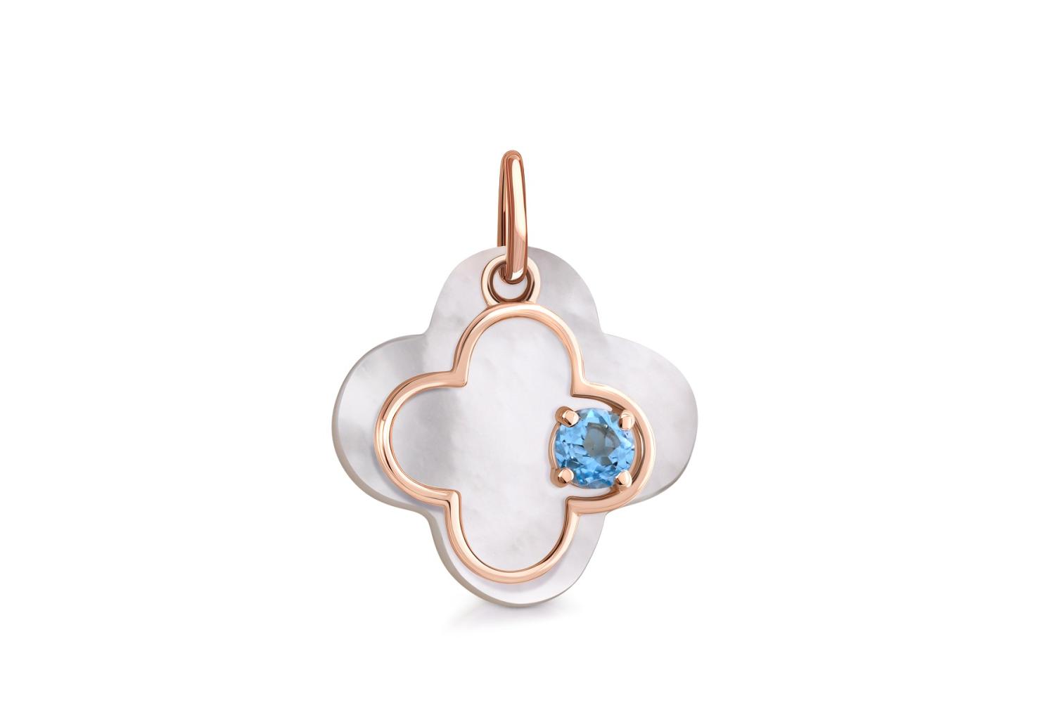 Мастера компании NEWGOLD, приложив всё свое мастерство и искусство, создали для Вас на нашем собственном производстве Подвеска Клевер из красного золота с перламутром и топазом swiss.