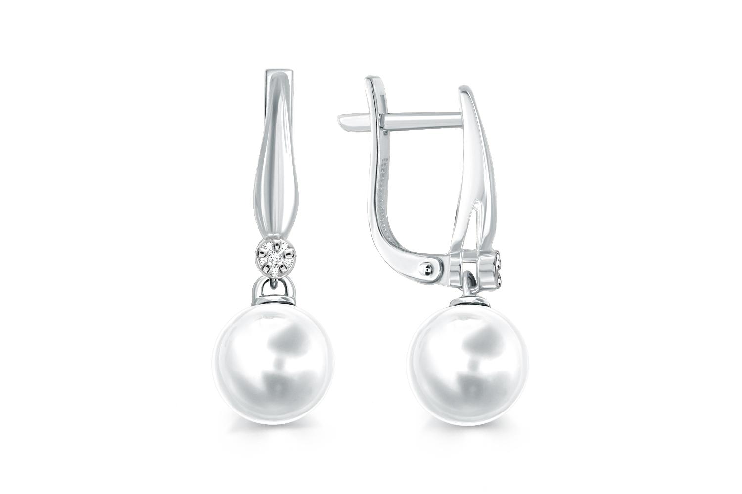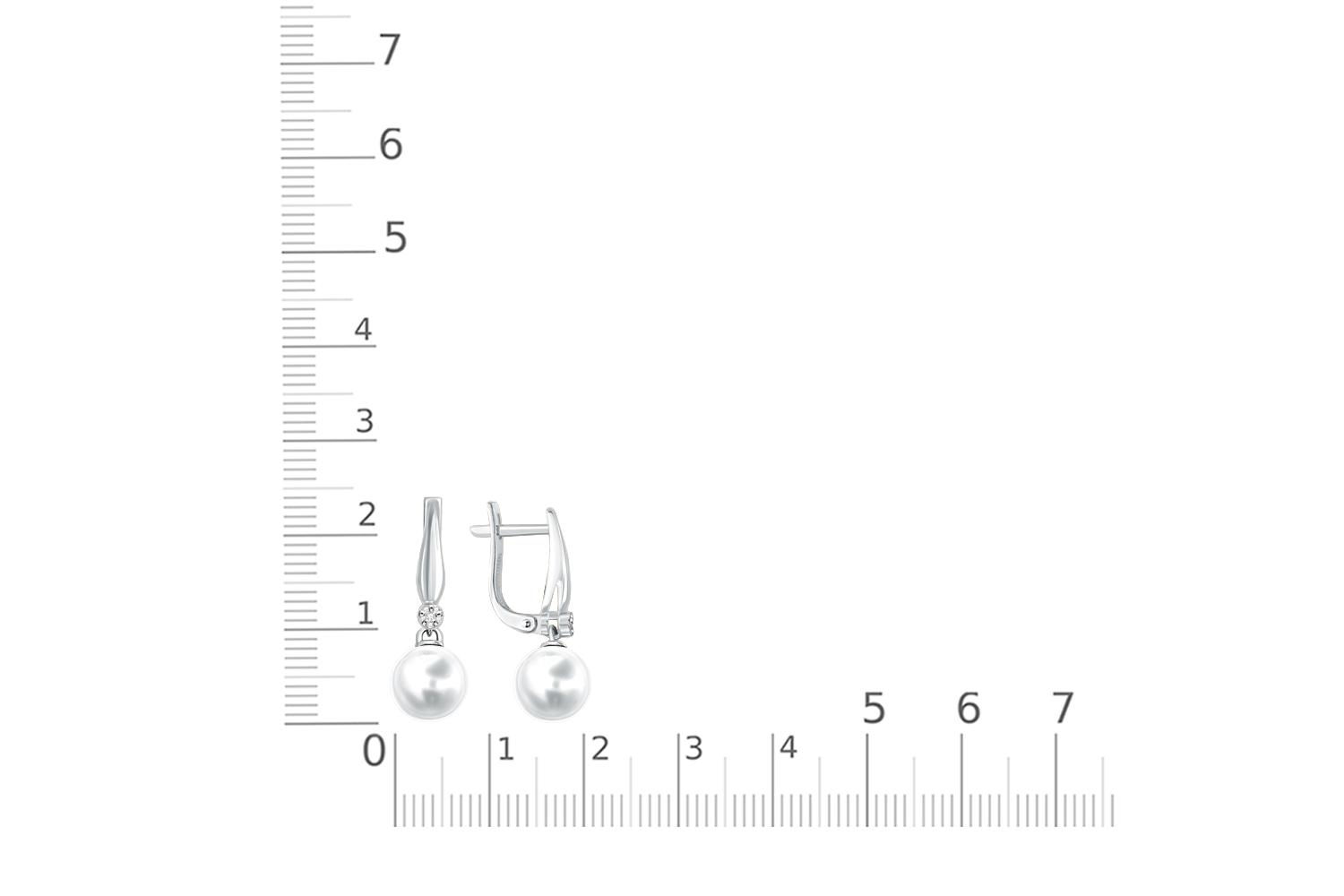Жемчуг белый натуральный, количество 2 шт., огранка круг, размер 8ˣ8,5 ; Бриллиант, количество 2 шт., огранка Кр-17, размер 1 мм, цвет 2, чистота 2, вес 0,01 карат. ; Бриллиант, количество 10 шт., огранка Кр-17, размер 0,7 мм, цвет 2, чистота 2, вес 0,0