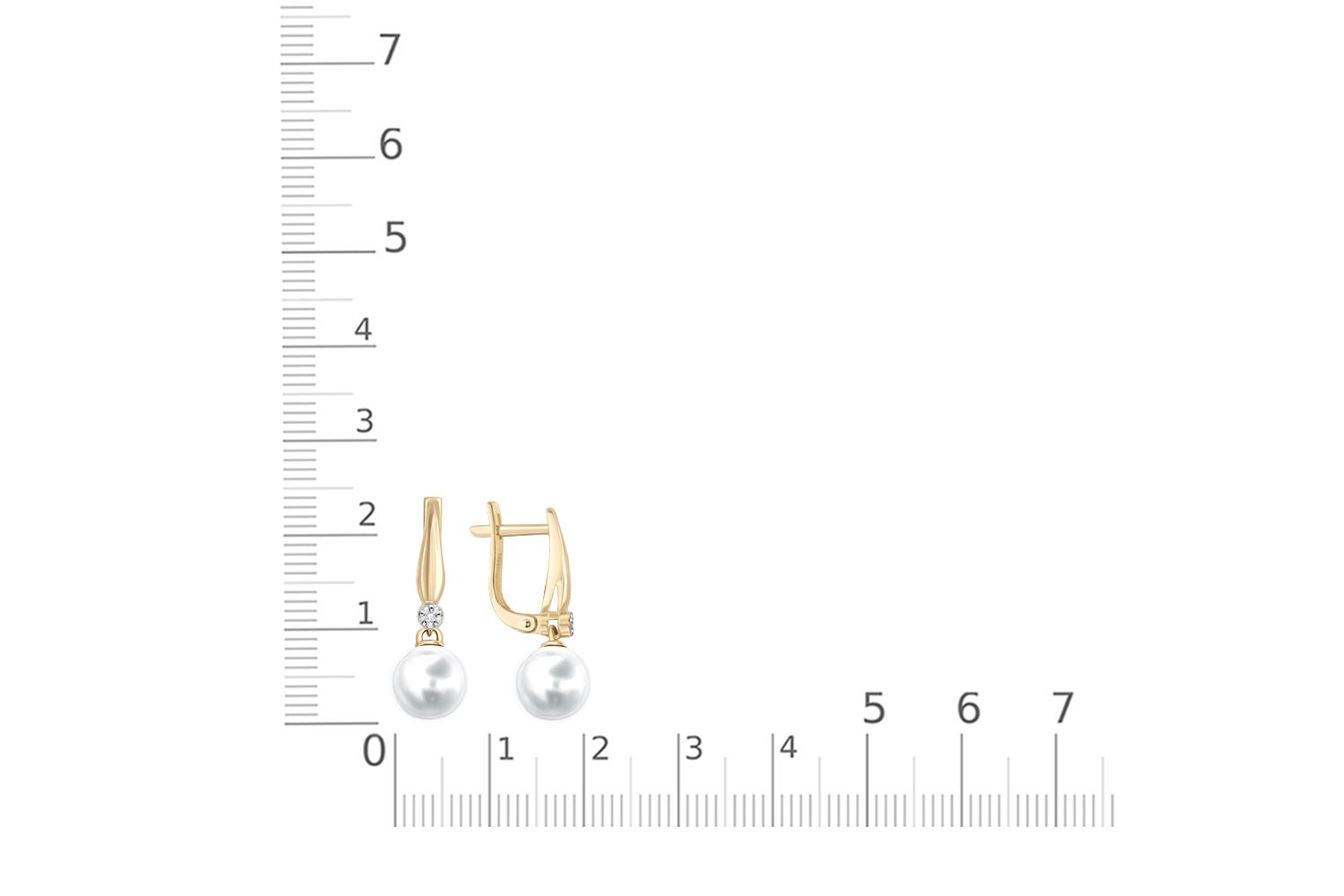Жемчуг белый натуральный, количество 2 шт., огранка круг, размер 8ˣ8,5 ; Бриллиант, количество 2 шт., огранка Кр-17, размер 1 мм, цвет 2, чистота 2, вес 0,01 карат. ; Бриллиант, количество 10 шт., огранка Кр-17, размер 0,7 мм, цвет 2, чистота 2, вес 0,0