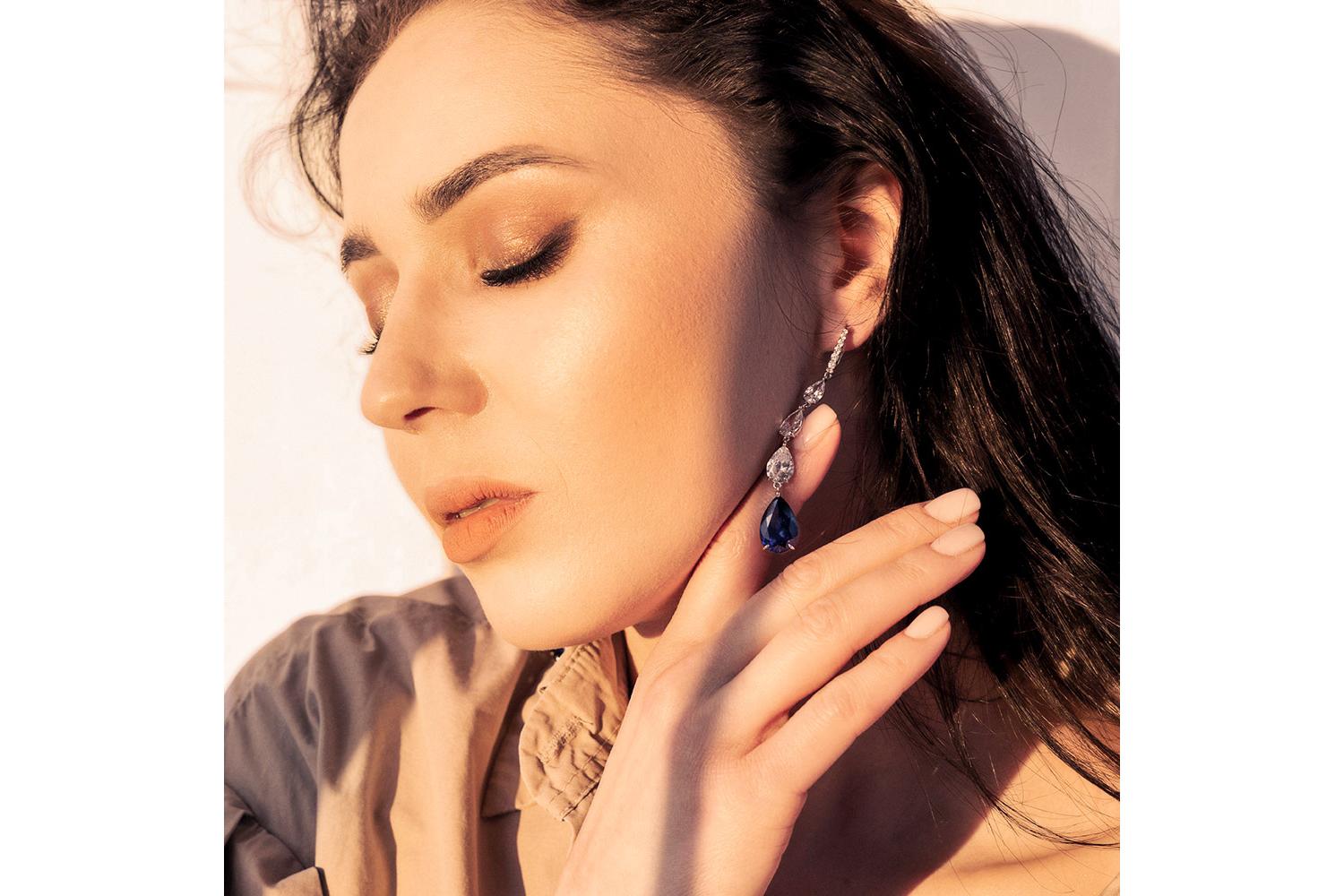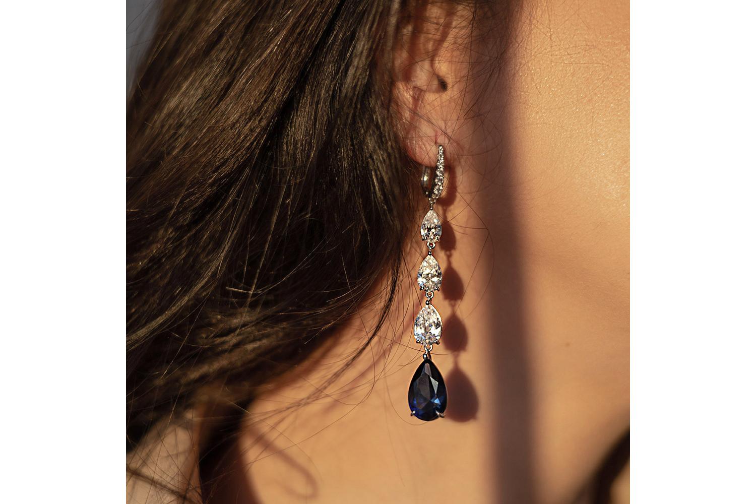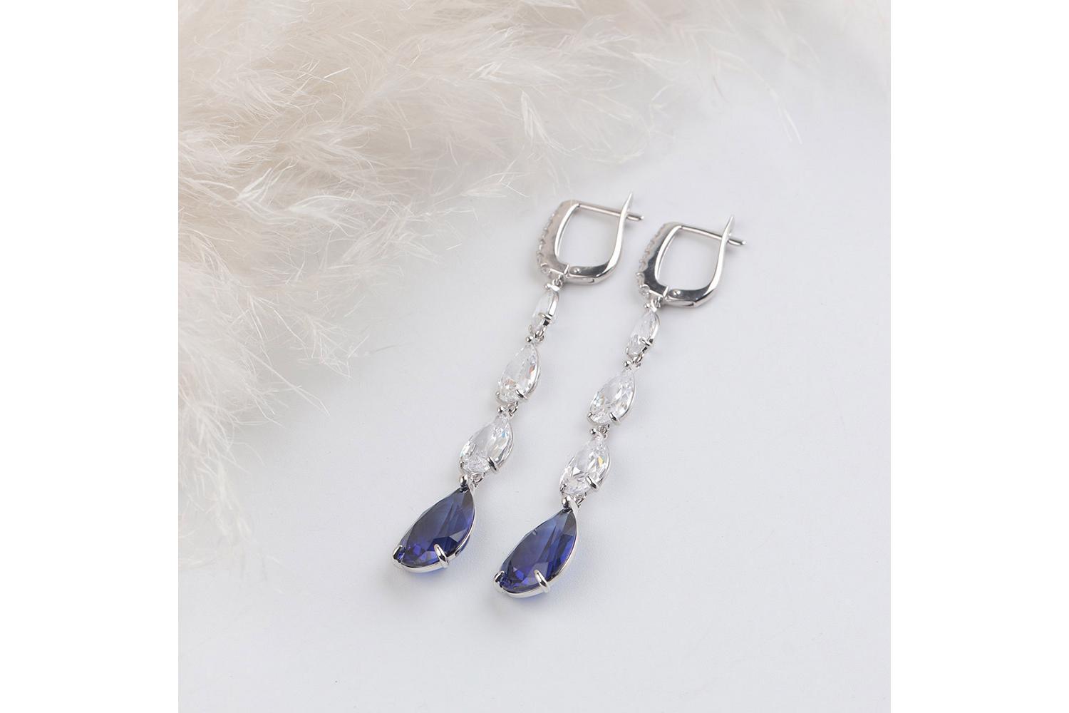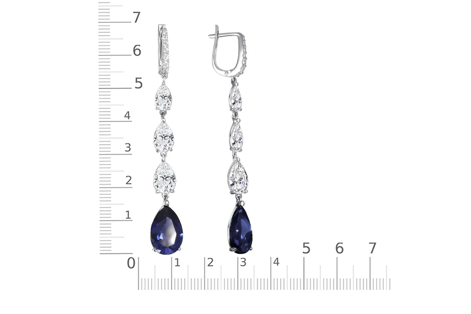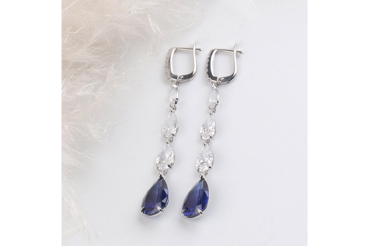 Сапфир Гт искусственный, количество 2 шт., огранка груша-бриолет, размер 15ˣ10 ; Фианит б/цв, количество 2 шт., огранка груша, размер 10ˣ7 ; Фианит б/цв, количество 2 шт., огранка груша, размер 9ˣ6 ; Фианит б/цв, количество 2 шт., огранка груша, размер