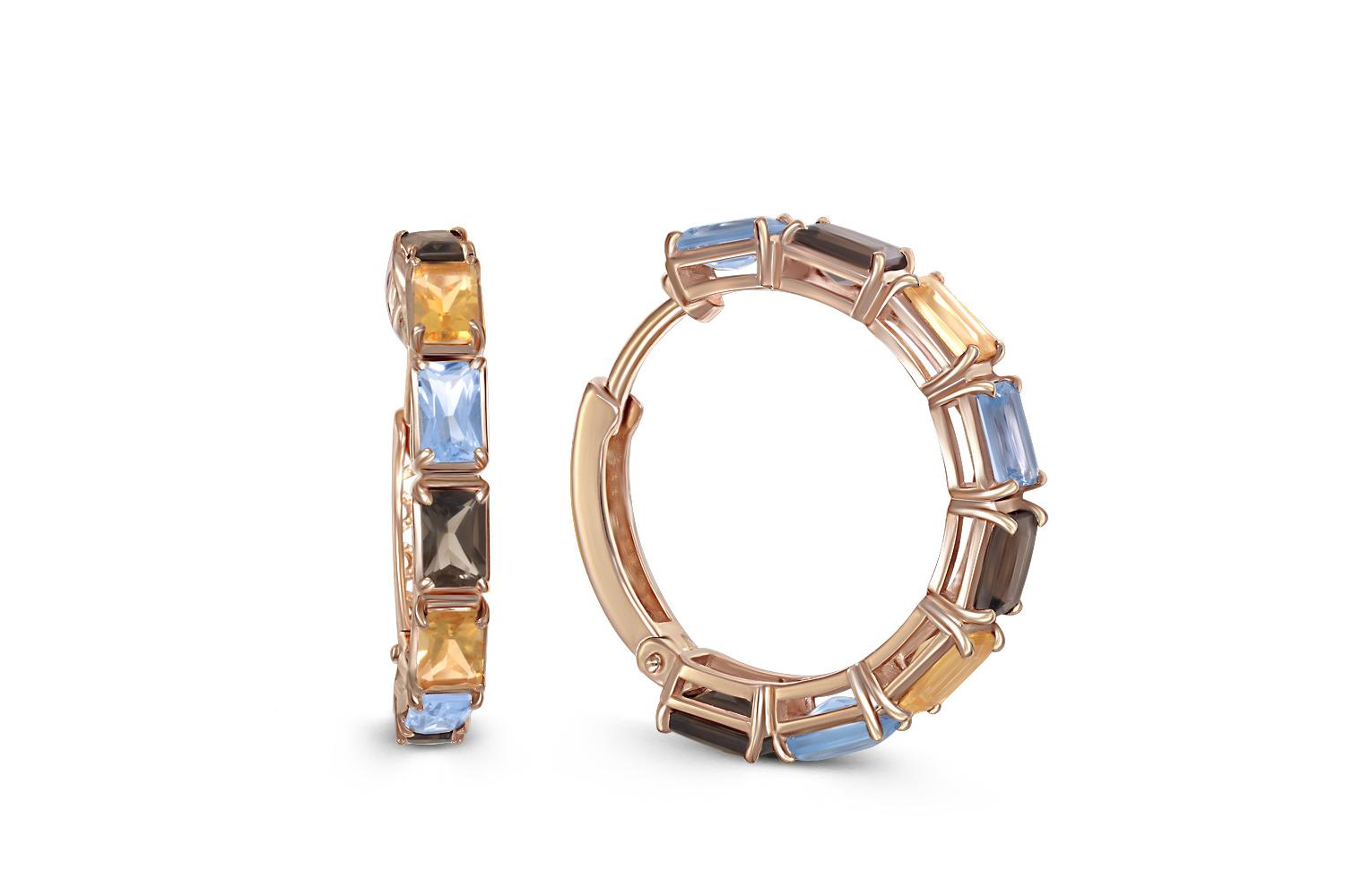 Мастера компании NEWGOLD, приложив всё свое мастерство и искусство, создали для Вас на нашем собственном производстве Серьги из красного золота с раухтопазами, топазами sky и цитринами.