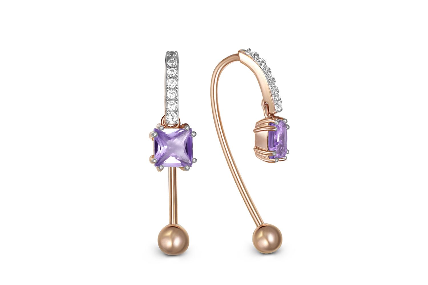 Мастера компании NEWGOLD, приложив всё свое мастерство и искусство, создали для Вас на нашем собственном производстве Серьги из красного золота с 2 аметистами и 14 фианитами.