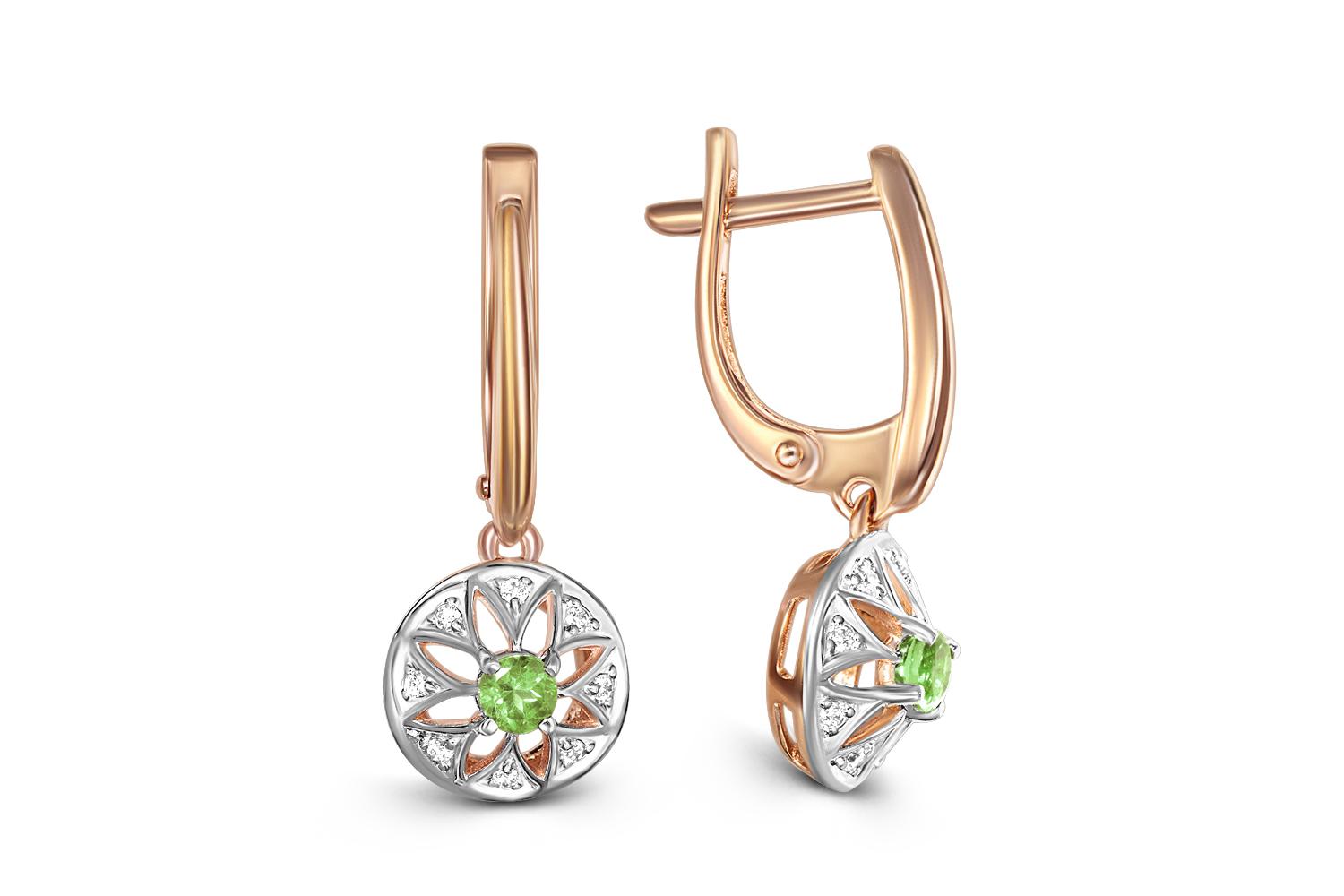 Мастера компании NEWGOLD, приложив всё свое мастерство и искусство, создали для Вас на нашем собственном производстве Серьги Цветы из красного золота с 2 хризолитами и 16 фианитами.