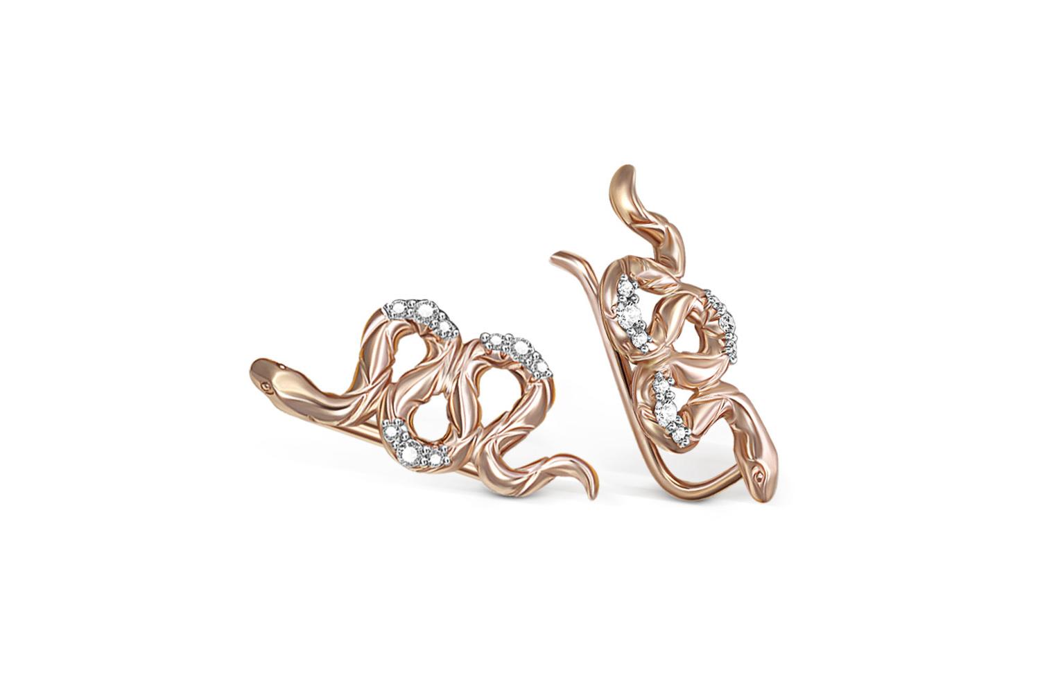 Мастера компании NEWGOLD, приложив всё свое мастерство и искусство, создали для Вас на нашем собственном производстве Серьги Змеи из красного золота с 18 фианитами.
