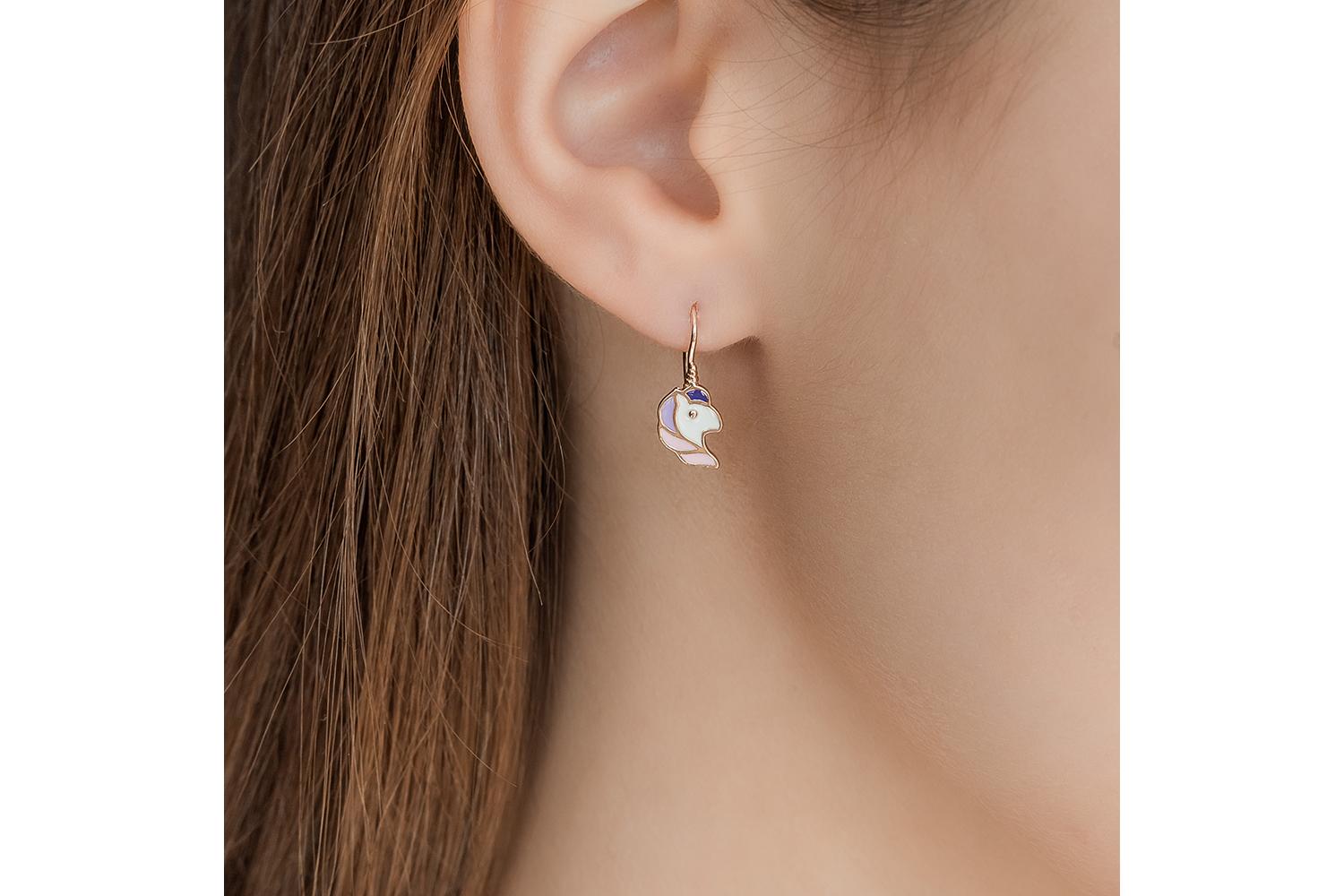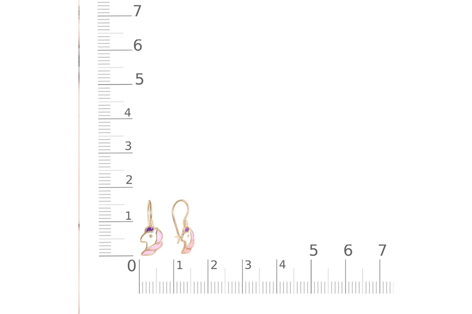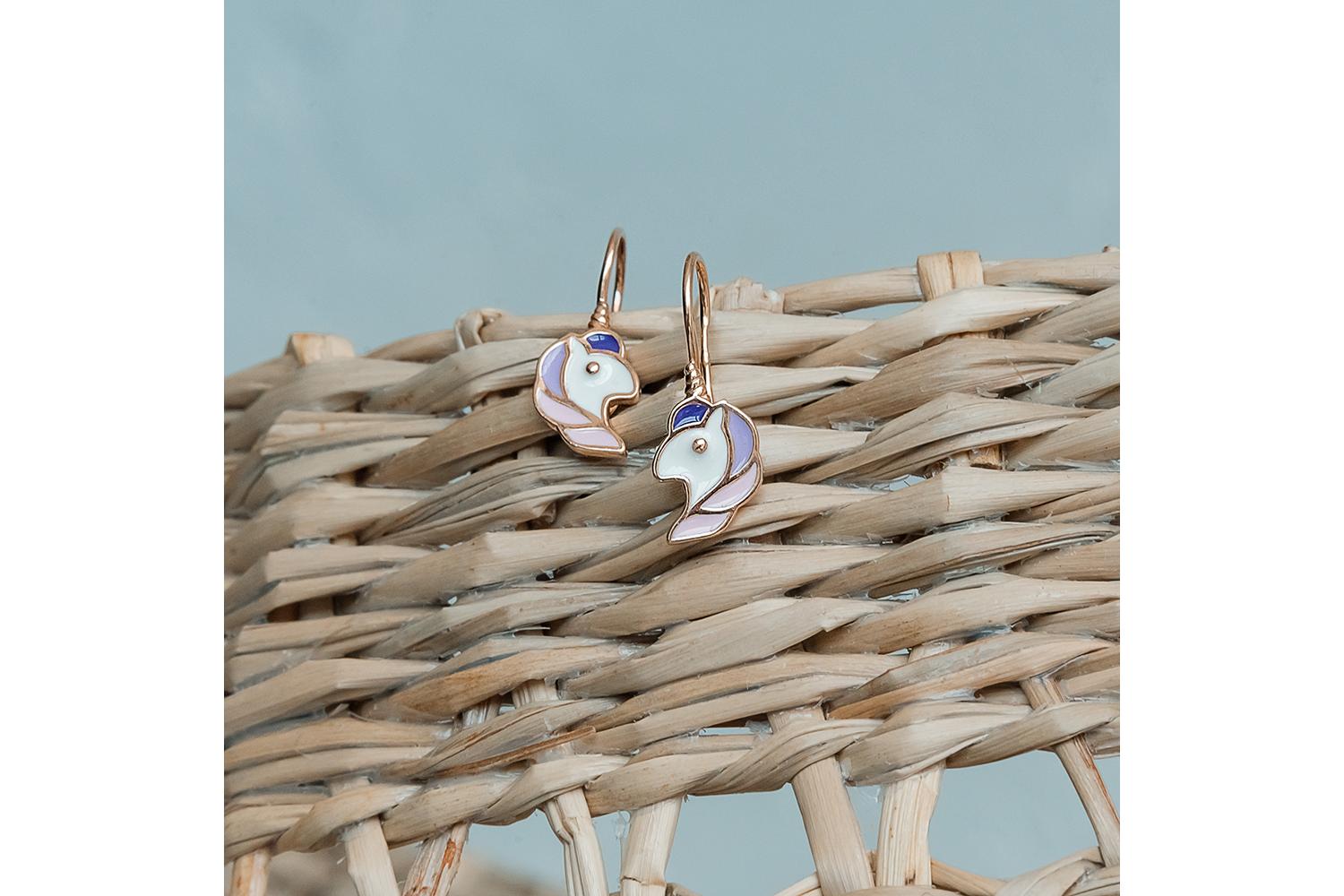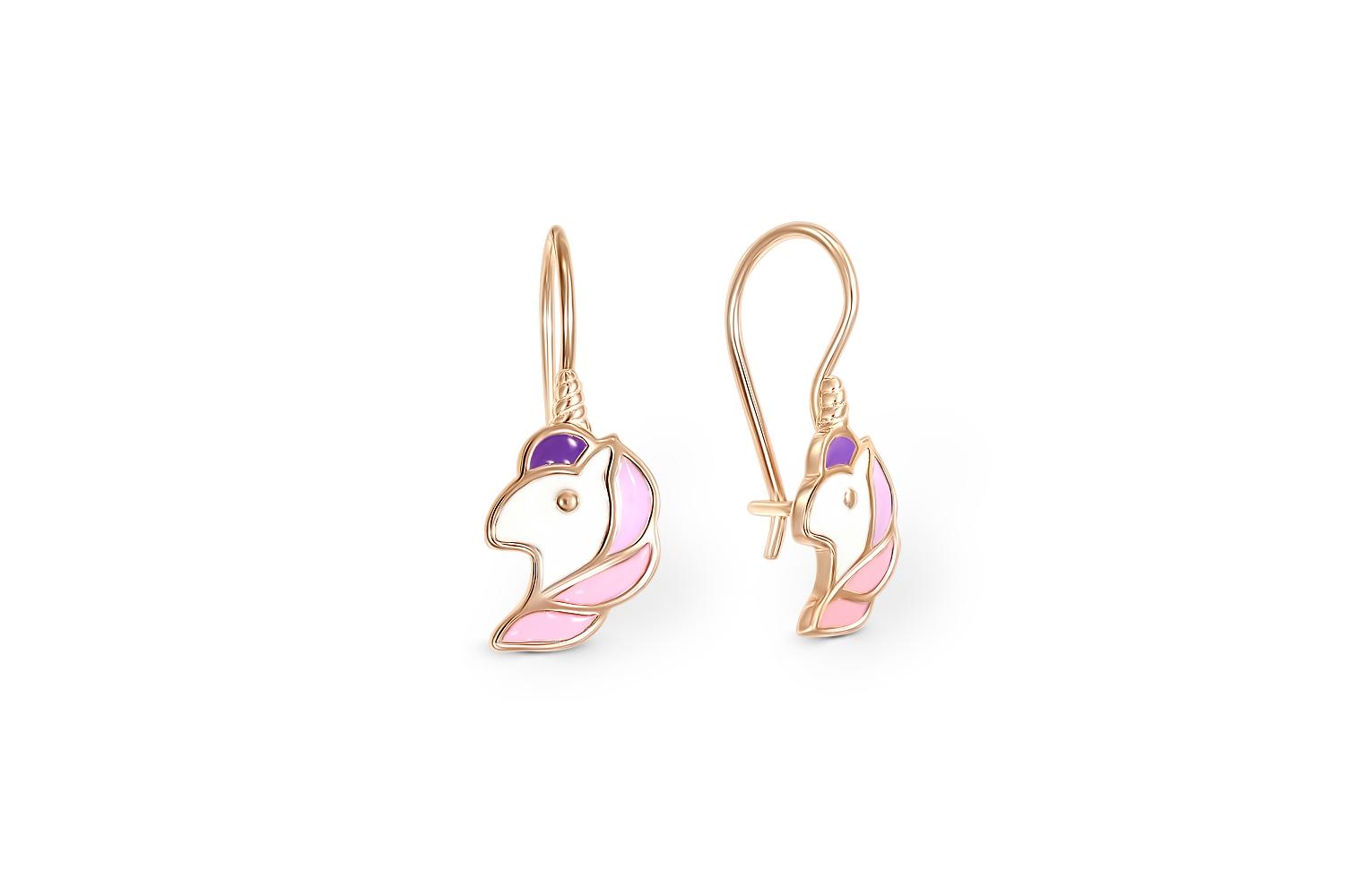 Изящные детские серьги-единороги выполнены из красного золота с нежным цветной эмалью. Миниатюрные подвески имеют оригинальную форму мифических существ - стилизованных единорогов с выразительным силуэтом. Розовые и сиреневые эмалевые вставки создают мягкую цветовую гамму, подчеркивая женственность и хрупкость изделия.