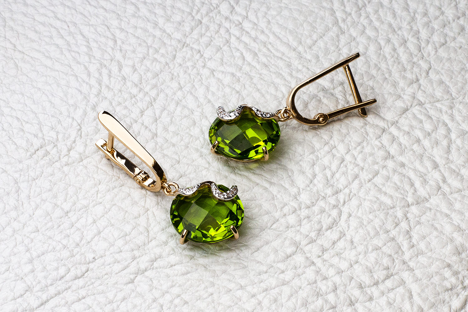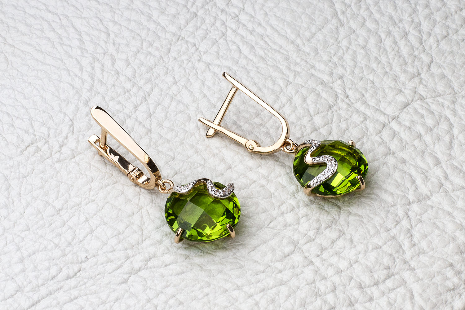Ситалл хризолит иск, количество 2 шт., огранка круг-бриолет, размер 12 мм ; Фианит б/цв, количество 14 шт., огранка круг, размер 1 мм