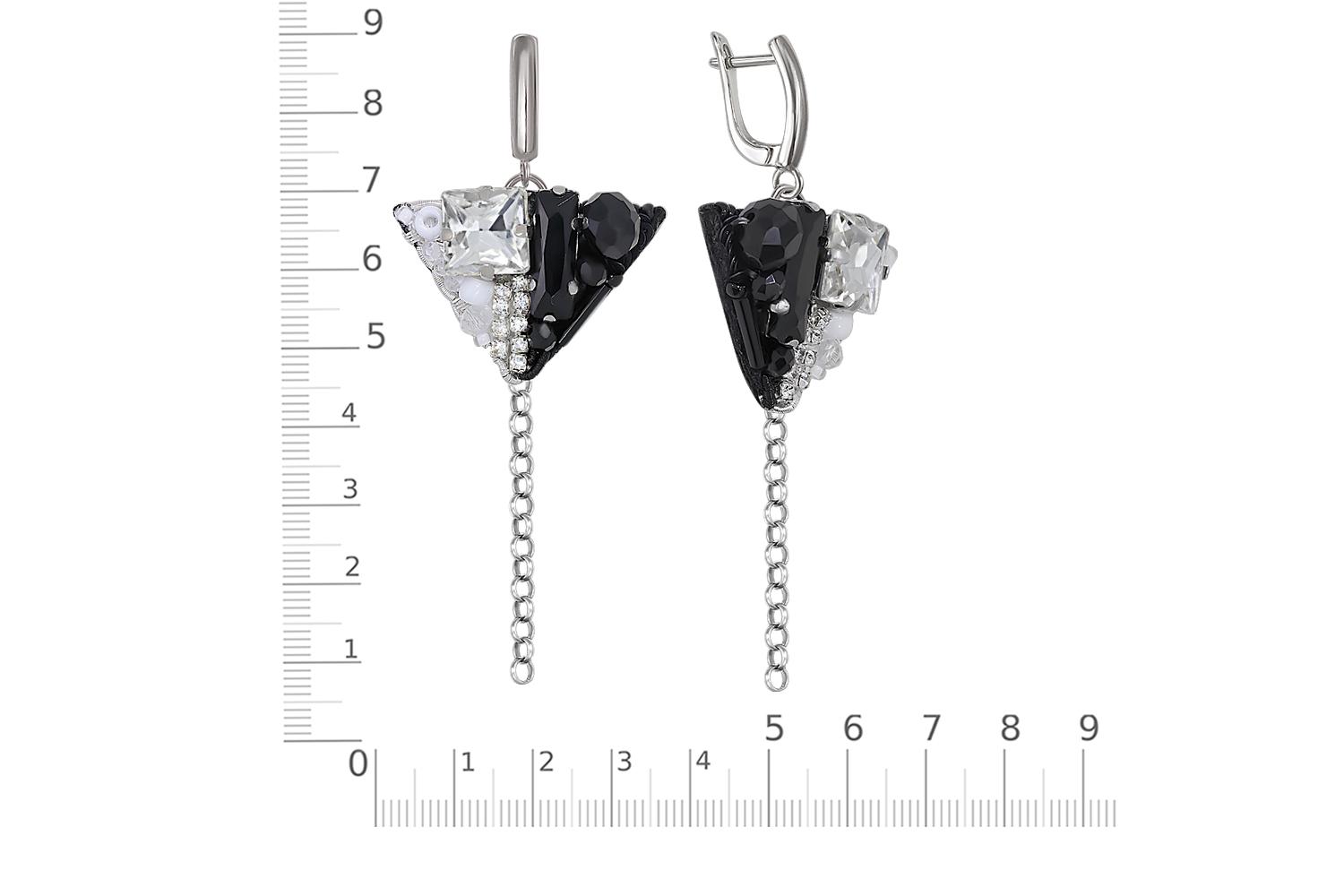 Геометрические вкрапления кристаллов подчеркивают грань между черными и белыми секциями, создавая эффект мерцающей границы. Изящные цепочки-подвески дополняют форму серёжек, придавая им легкость и воздушность. Дизайн буквально балансирует между строгостью архитектурных форм и артистической свободой ювелирной композиции. Украшение идеально подойдет женщине с изысканным вкусом, ценящей смелые геометрические решения в аксессуарах.