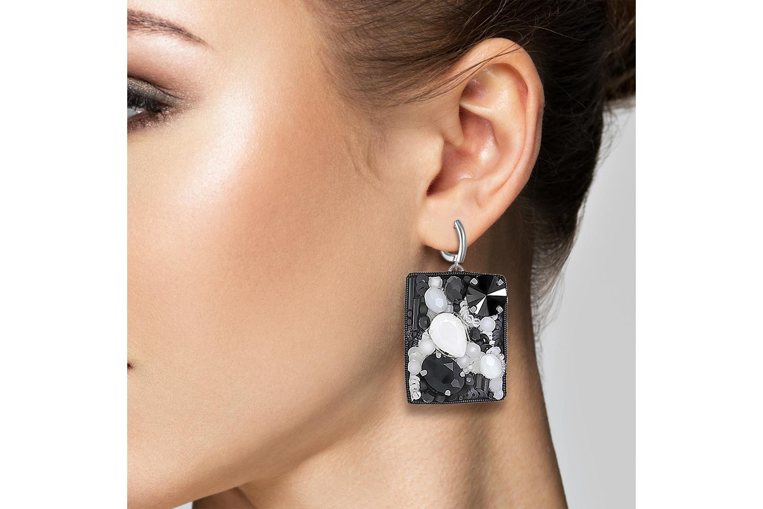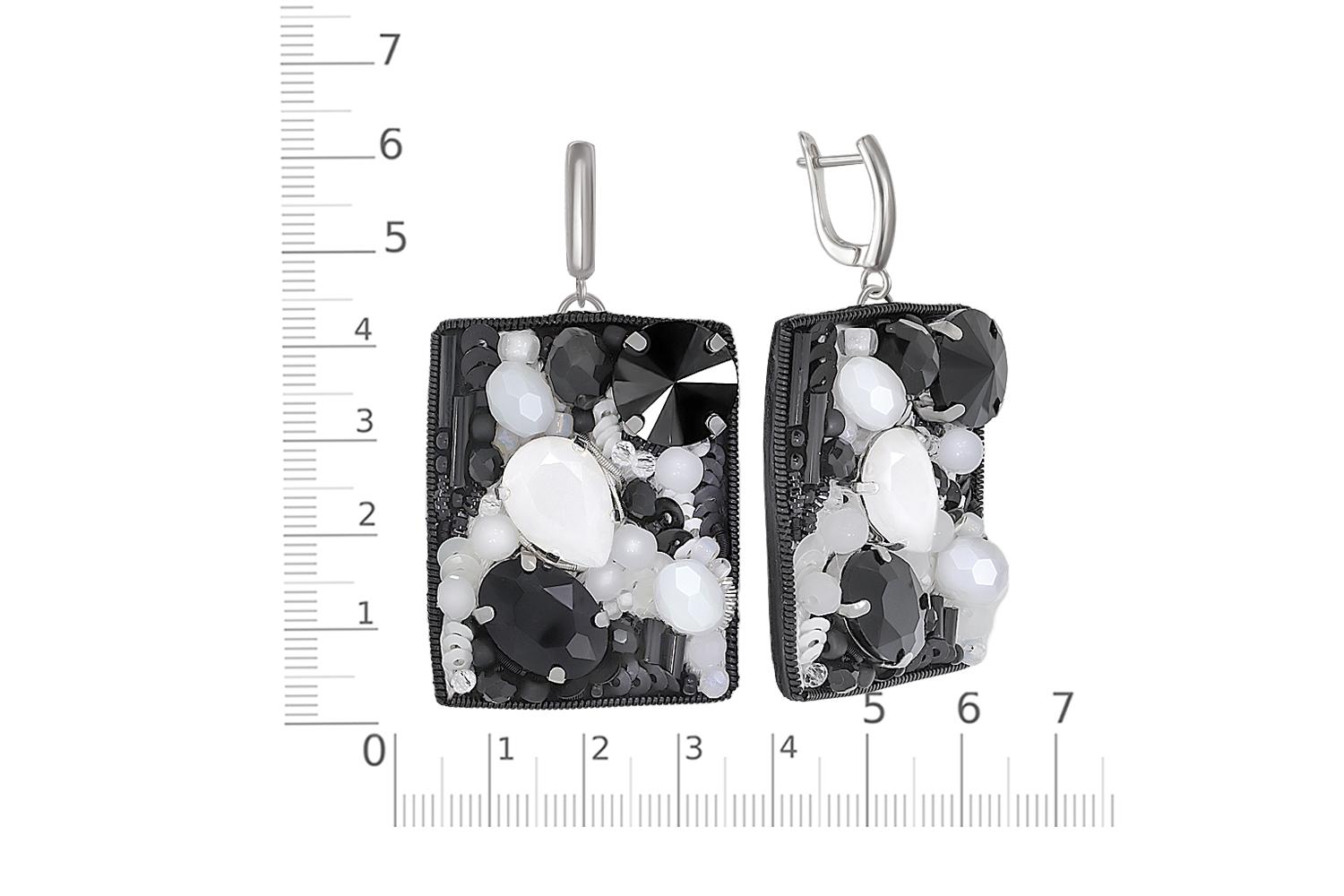 Изысканные серьги-подвески представляют собой миниатюрные художественные композиции в черно-белой гамме. Драгоценные камни различных оттенков - от глубокого черного до молочно-белого - закреплены в прямоугольной оправе с тонкой металлической окантовкой. Геометрическая структура украшения создает впечатление мозаичности и современного дизайна. Крупные граненые кристаллы контрастируют с более мелкими камешками, что придает изделию динамичность и визуальную глубину.