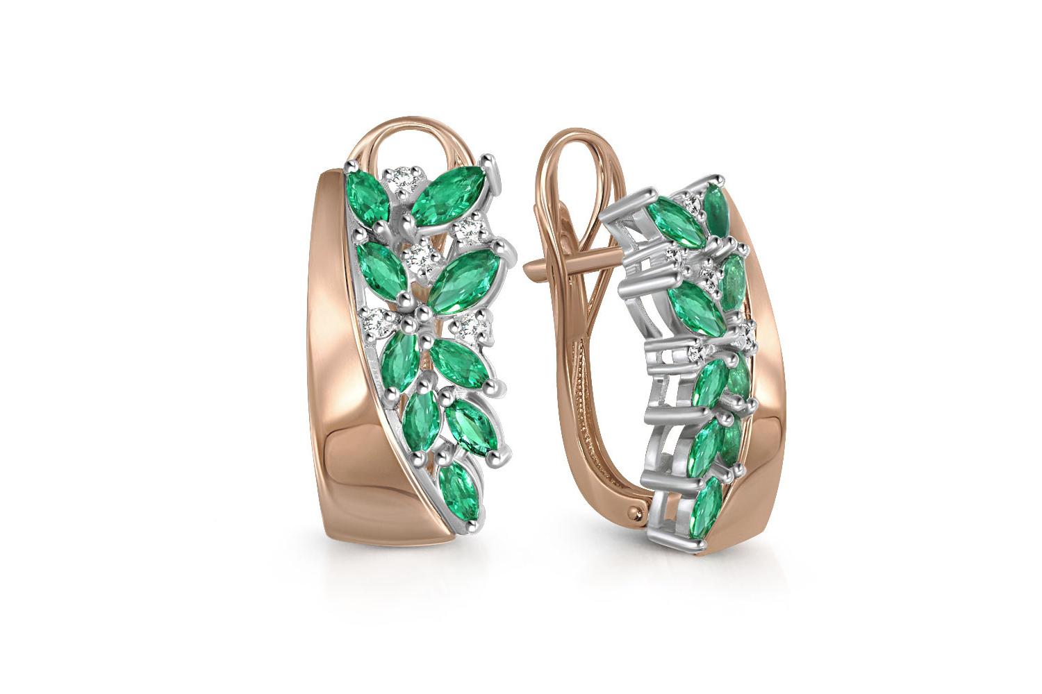 Восхитительные серьги представляют собой истинное воплощение ювелирного искусства. Изящные украшения выполнены из комбинированного золота - нежно-розового и благородного белого металла. Центральным акцентом служат изумительные изумруды - 18 камней огранки "маркиз", выложенные в элегантный растительный орнамент.