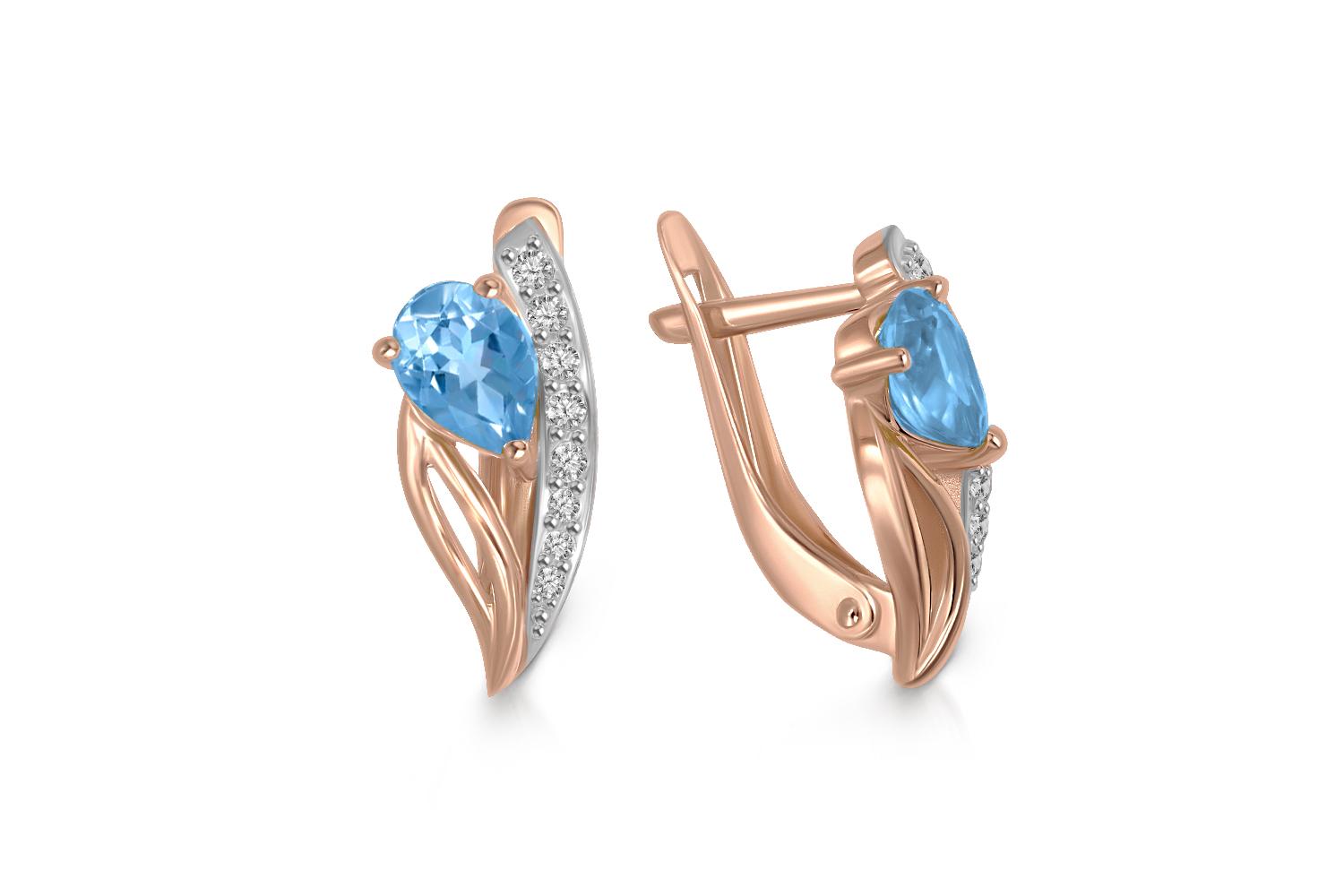 Мастера компании NEWGOLD, приложив всё свое мастерство и искусство, создали для Вас на нашем собственном производстве Серьги из красного золота с 2 топазами swiss и 16 фианитами.