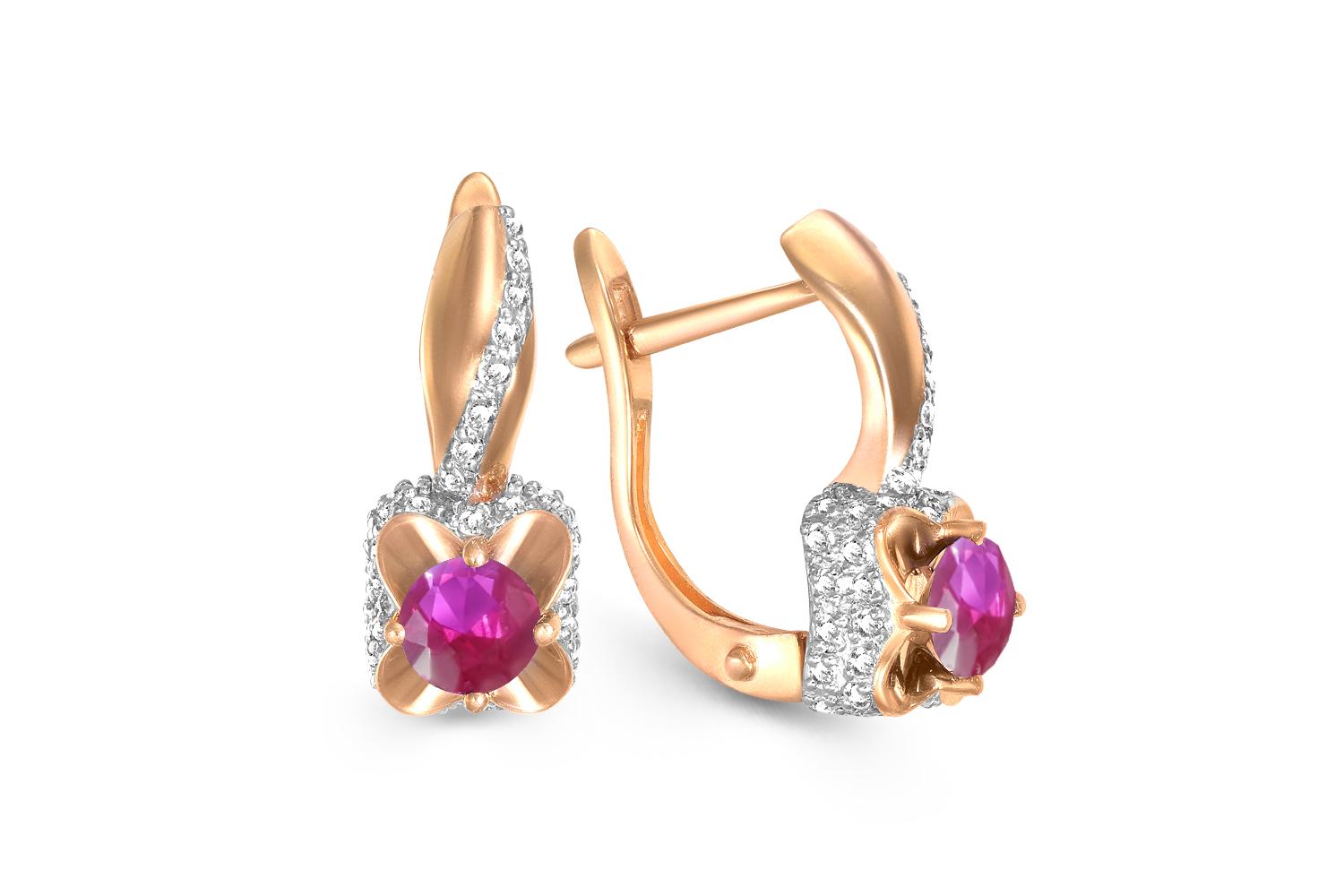 Мастера компании NEWGOLD, приложив всё свое мастерство и искусство, создали для Вас на нашем собственном производстве Серьги из красного золота с 2 корундами и 86 бриллиантами.