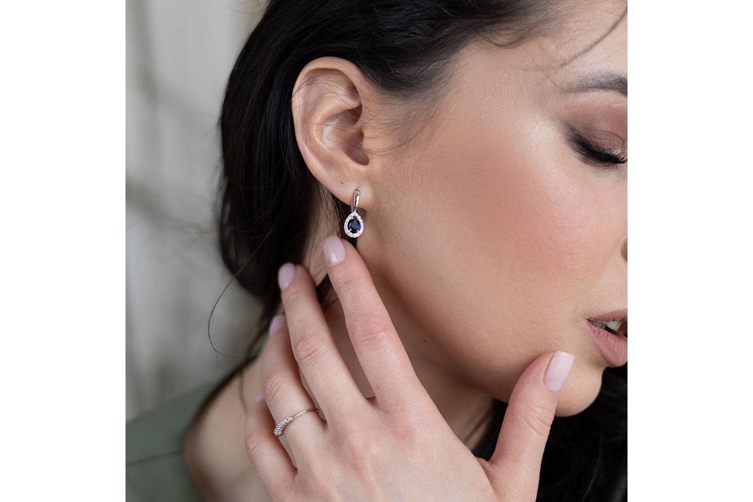 Корунд сапфир синт, количество 2 шт., огранка груша, размер 6ˣ4 ; Бриллиант, количество 32 шт., огранка Кр-17, размер 1,25 мм, цвет 2, чистота 2, вес 0,3 карат.