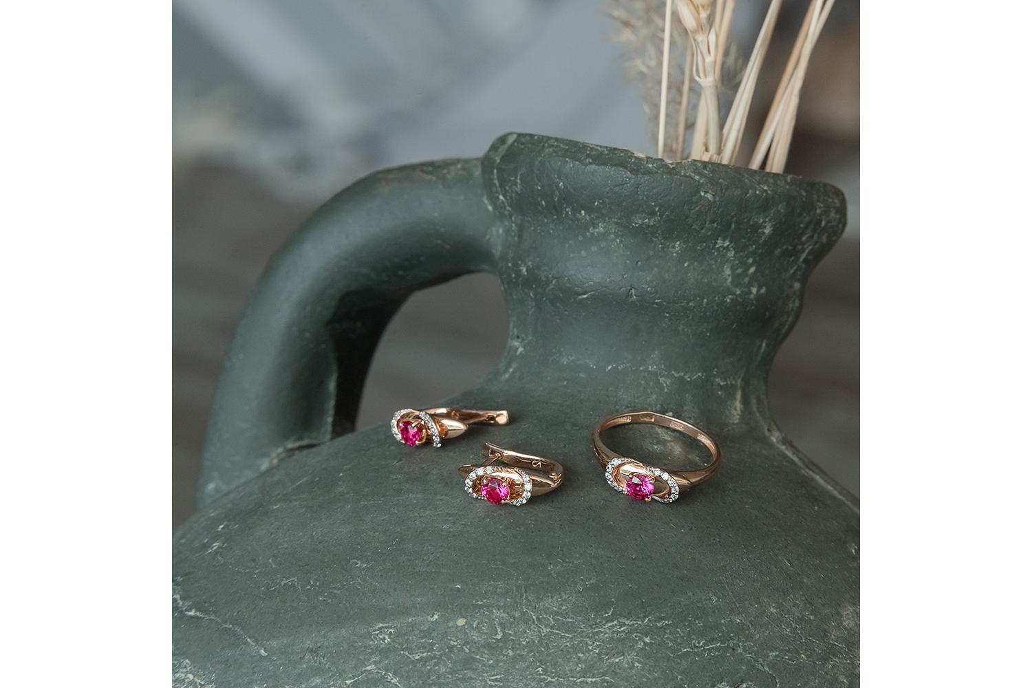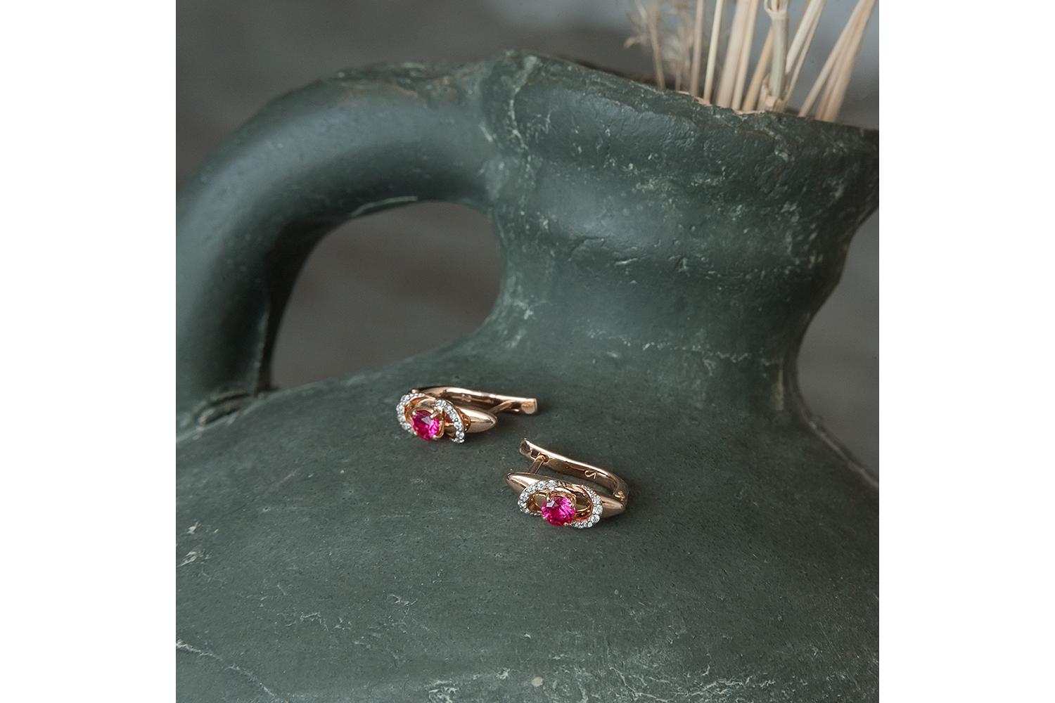 Мастера компании NEWGOLD, приложив всё свое мастерство и искусство, создали для Вас на нашем собственном производстве Серьги из красного золота с 2 корундами и 24 фианитами.