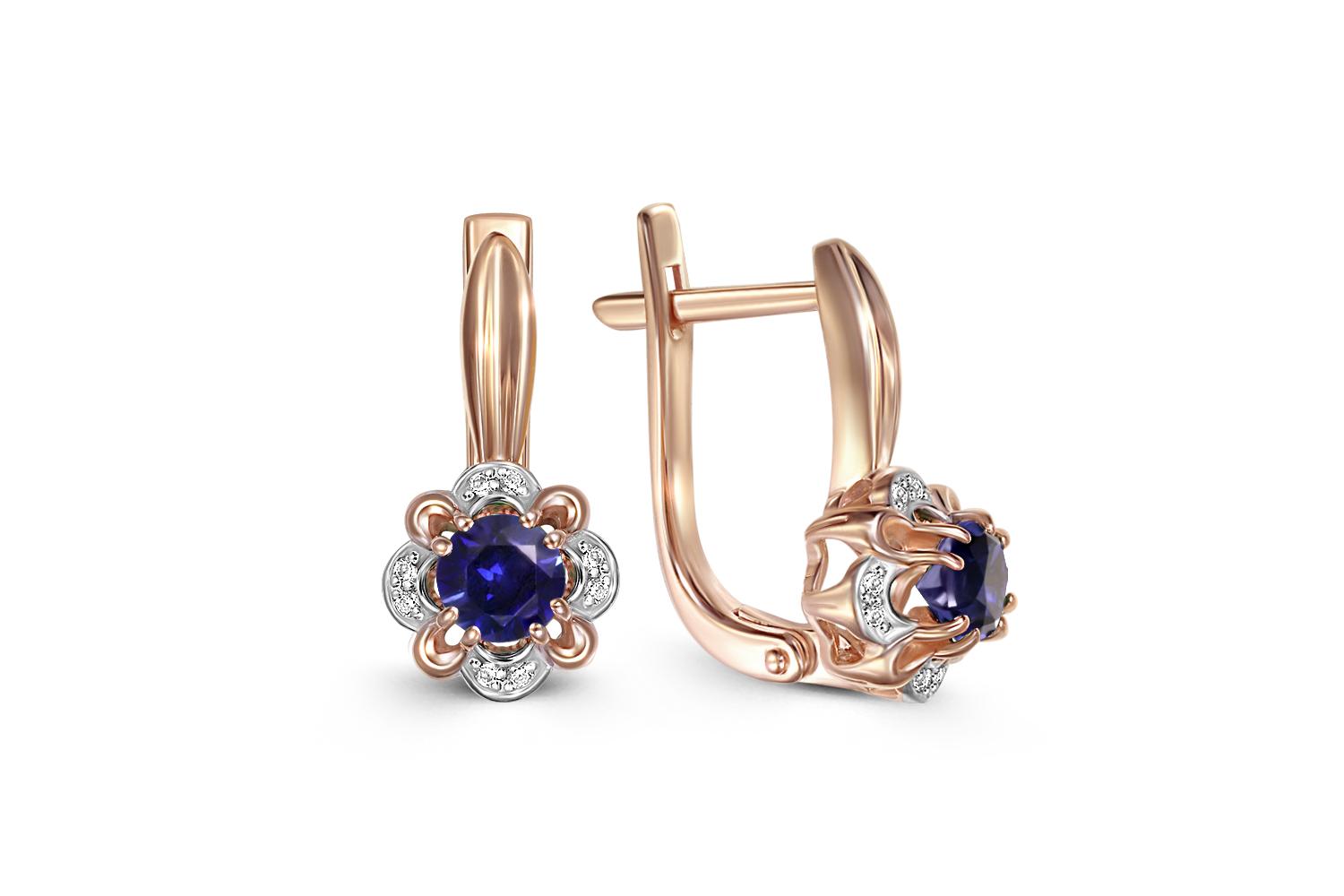 Мастера компании NEWGOLD, приложив всё свое мастерство и искусство, создали для Вас на нашем собственном производстве Серьги Цветы из красного золота с 2 корундами и 16 бриллиантами.
