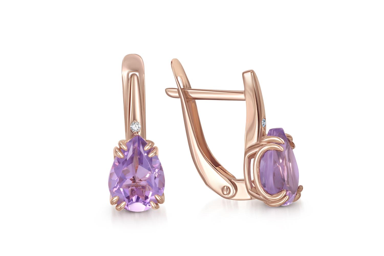 Мастера компании NEWGOLD, приложив всё свое мастерство и искусство, создали для Вас на нашем собственном производстве Серьги из красного золота с 2 аметистами и 2 фианитами.