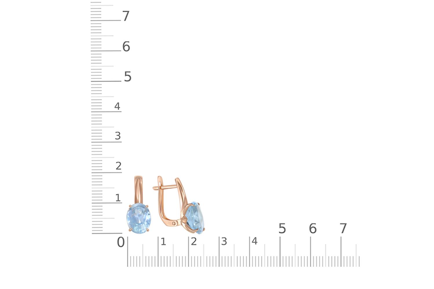 Изящные серьги красного золота 585 пробы, украшенные великолепными топазами нежного голубого оттенка sky blue. Камни огранены в овальную форму, что подчеркивает их прозрачность и глубину цвета. Дизайн серёжек элегантен и лаконичен - английская застёжка с плавными изогнутыми линиями обеспечивает надёжную фиксацию и комфортное ношение. Золотые детали имеют теплый розовый оттенок, который прекрасно оттеняет небесно-голубой топаз.