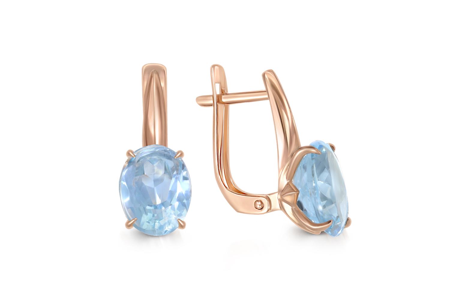 Изящные серьги красного золота 585 пробы, украшенные великолепными топазами нежного голубого оттенка sky blue. Камни огранены в овальную форму, что подчеркивает их прозрачность и глубину цвета.