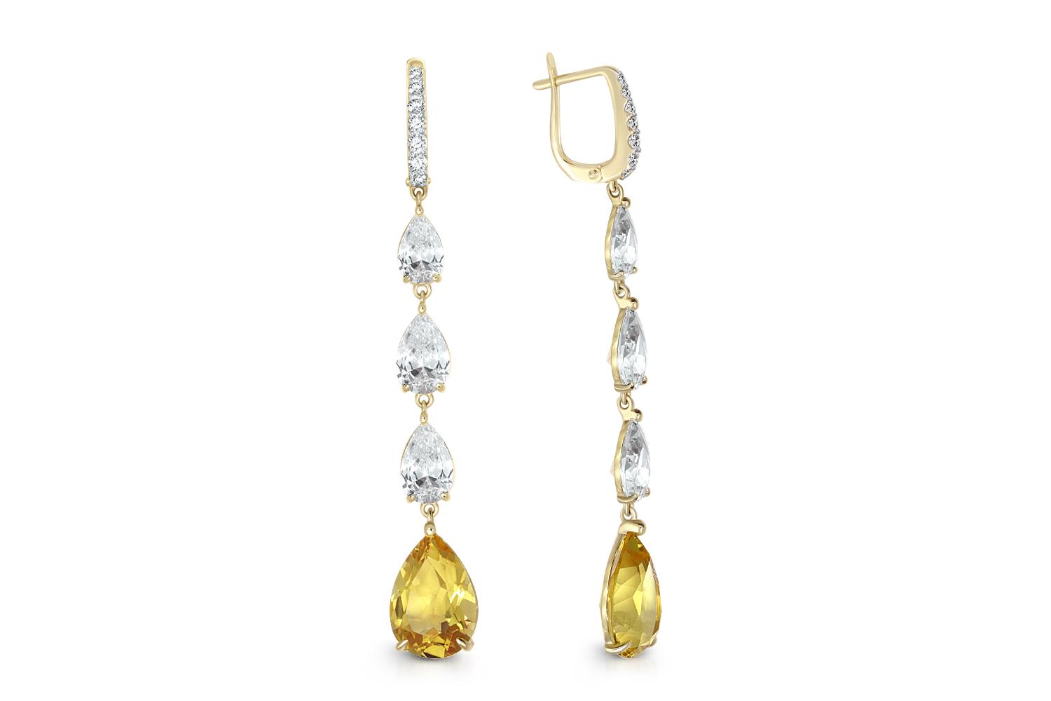 Кварц Цитрин натуральный, количество 2 шт., огранка груша, размер 15ˣ10 ; Фианит б/цв, количество 2 шт., огранка груша, размер 10ˣ7 ; Фианит б/цв, количество 2 шт., огранка груша, размер 9ˣ6 ; Фианит б/цв, количество 2 шт., огранка груша, размер 8ˣ5 ;
