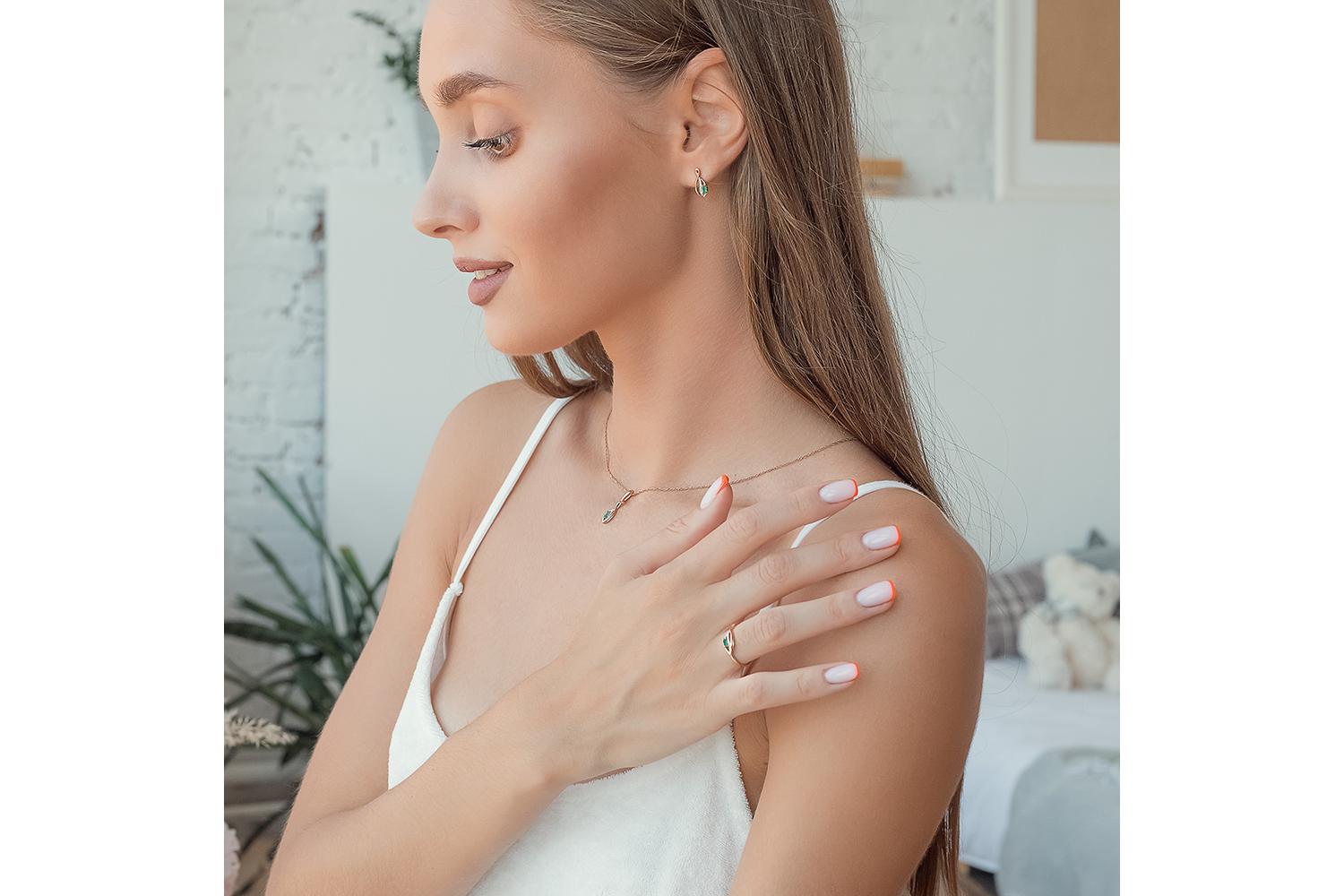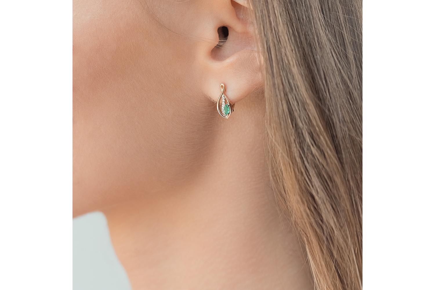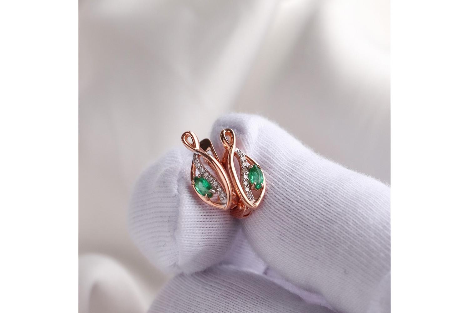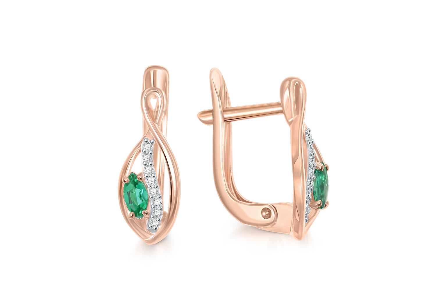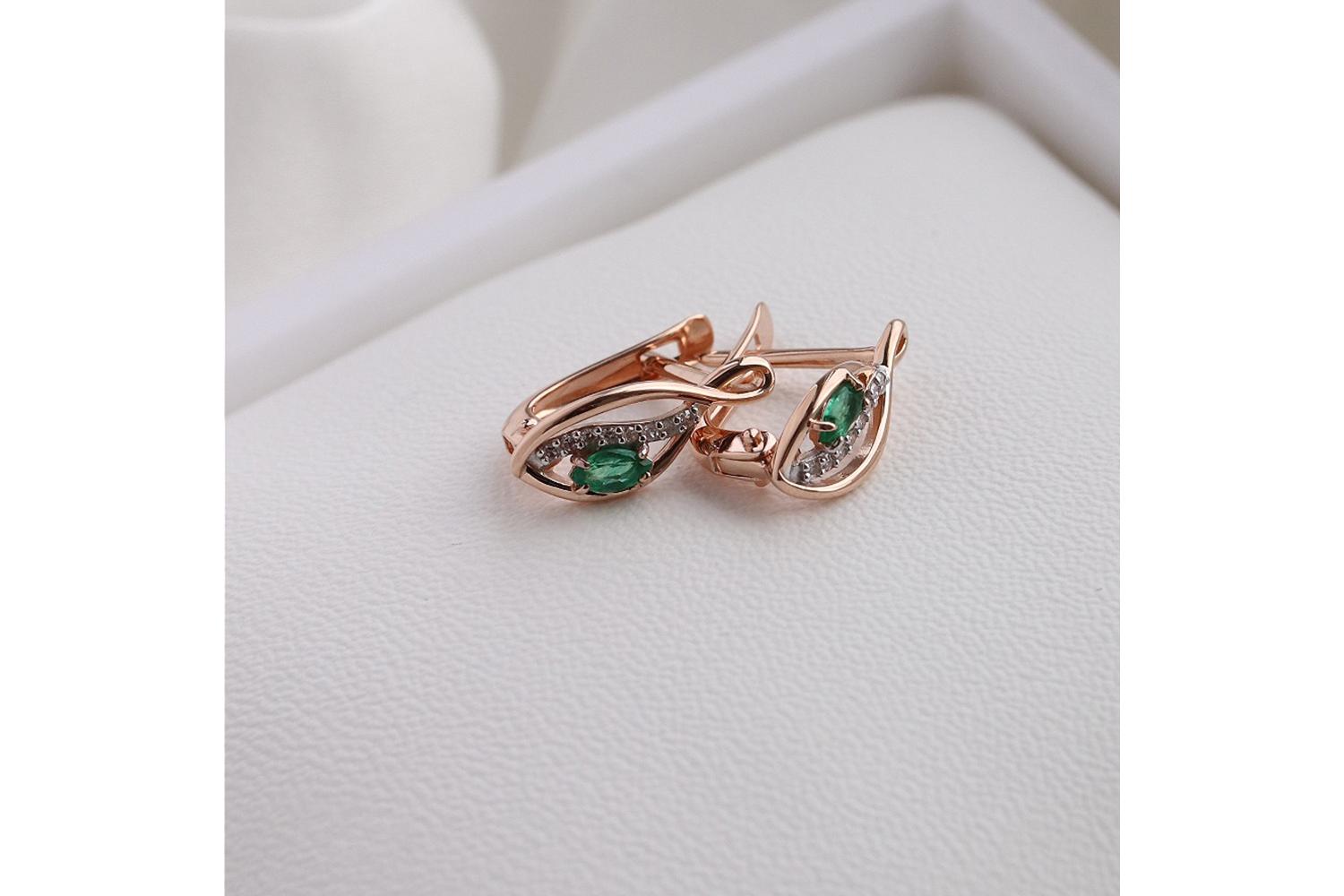 Замок серёжек - английский тип с надёжной фиксацией, что обеспечивает комфортное и безопасное ношение. Цветовое решение - розовое золото в сочетании с зелеными камнями и белыми бриллиантами - создает гармоничную цветовую композицию, которая подчеркнет женственность и вкус обладательницы.
