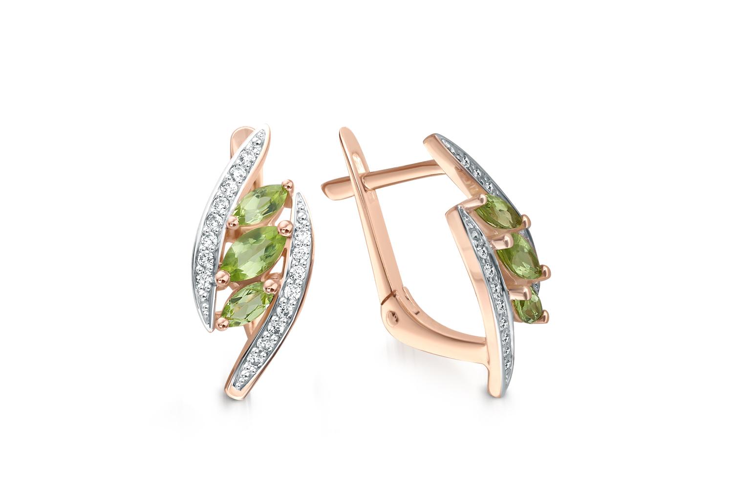 Хризолит натуральный, количество 2 шт., огранка маркиз, размер 5ˣ2,5 ; Хризолит натуральный, количество 4 шт., огранка маркиз, размер 4ˣ2 ; Фианит б/цв, количество 32 шт., огранка круг, размер 1 мм