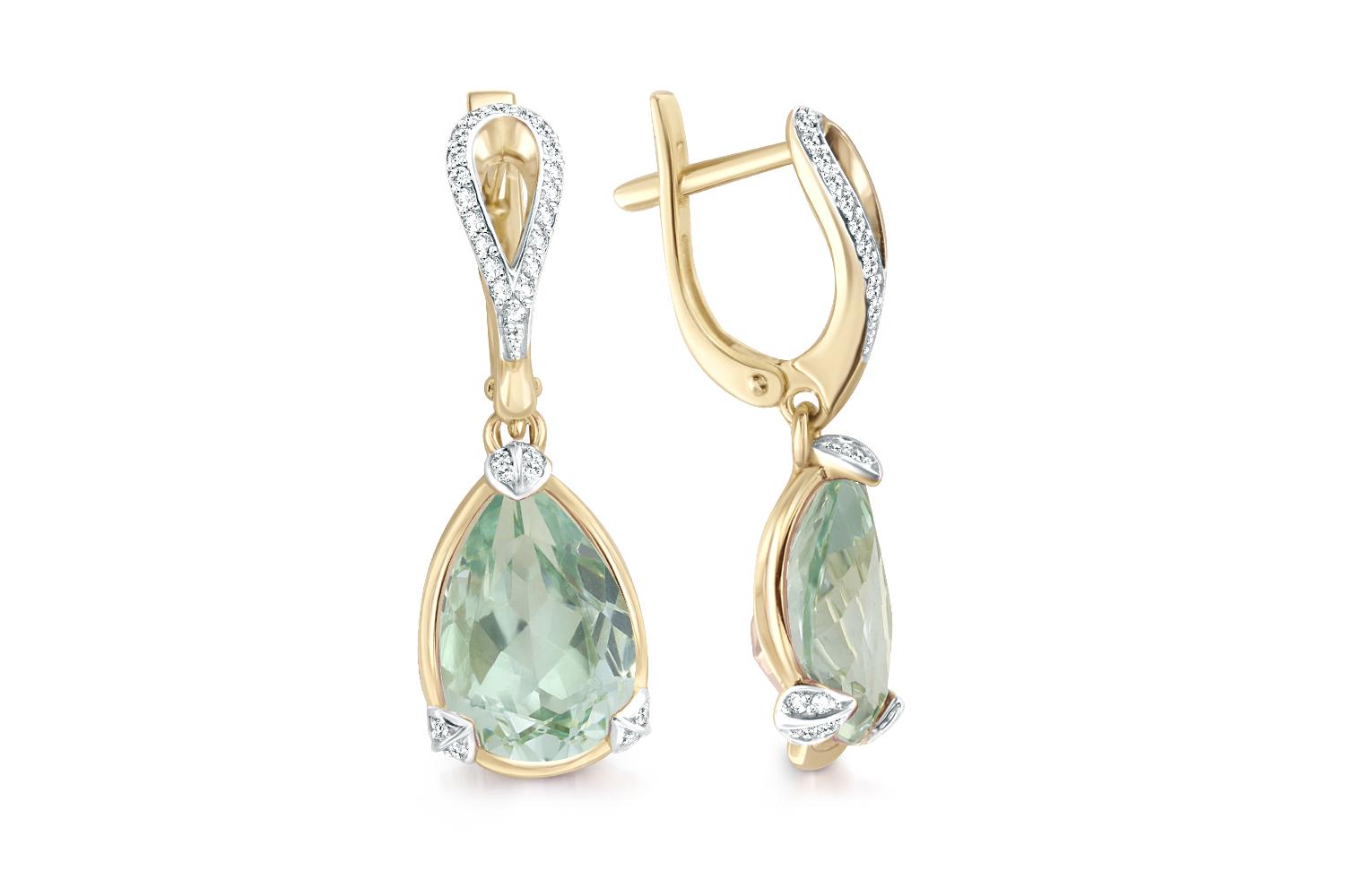 Наноситал Аметист зеленый, количество 2 шт., огранка груша, размер 12ˣ8 ; Фианит б/цв, количество 64 шт., огранка круг, размер 0,9 мм