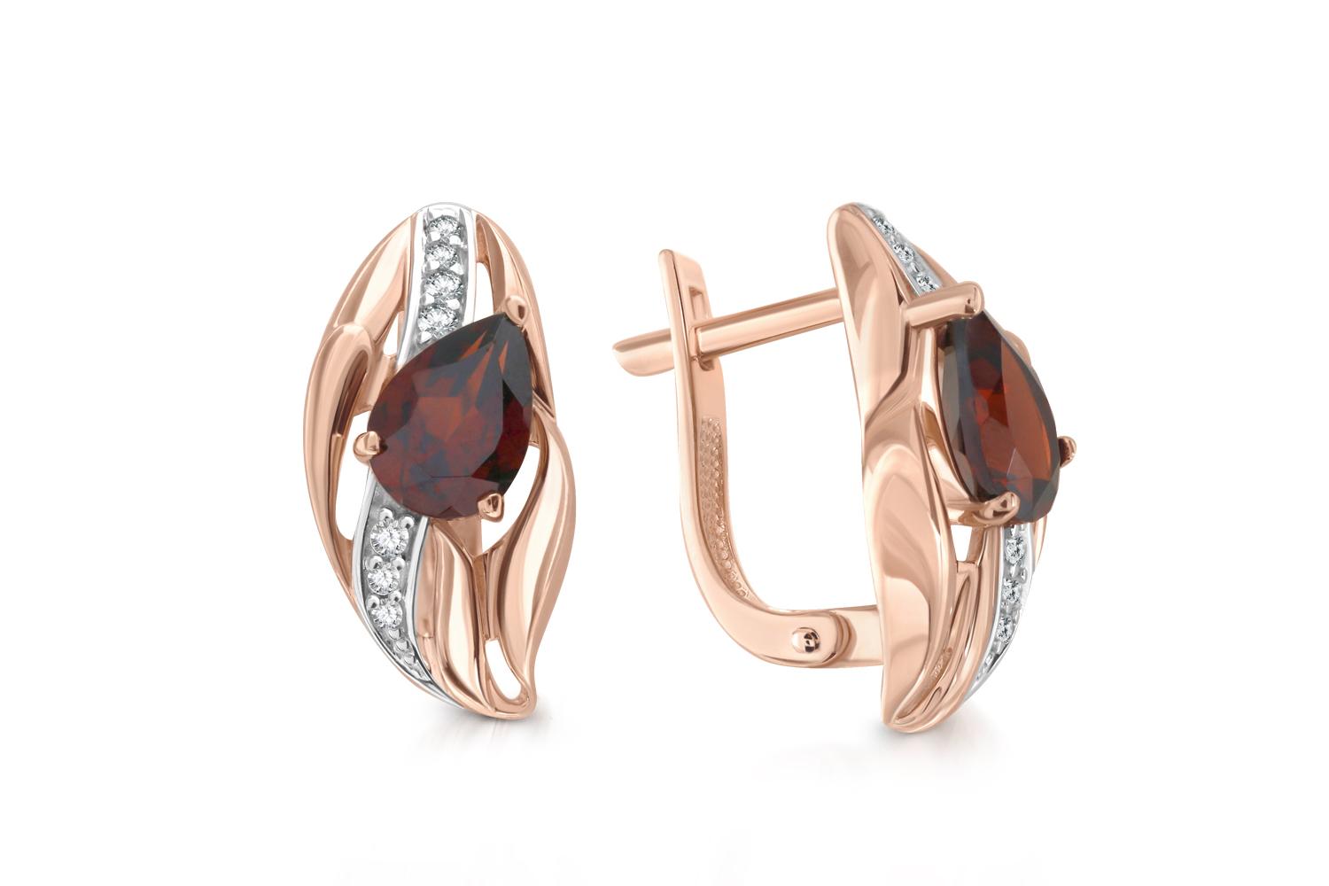 Металл: Золото, цвет: Красный , проба: 585. Вставки: Гранат натуральный, количество 2 шт. , огранка груша, размер 7*5 ; Фианит б/цв, количество 6 шт. , огранка круг, размер 1,25 мм ; Фианит б/цв, количество 8 шт.