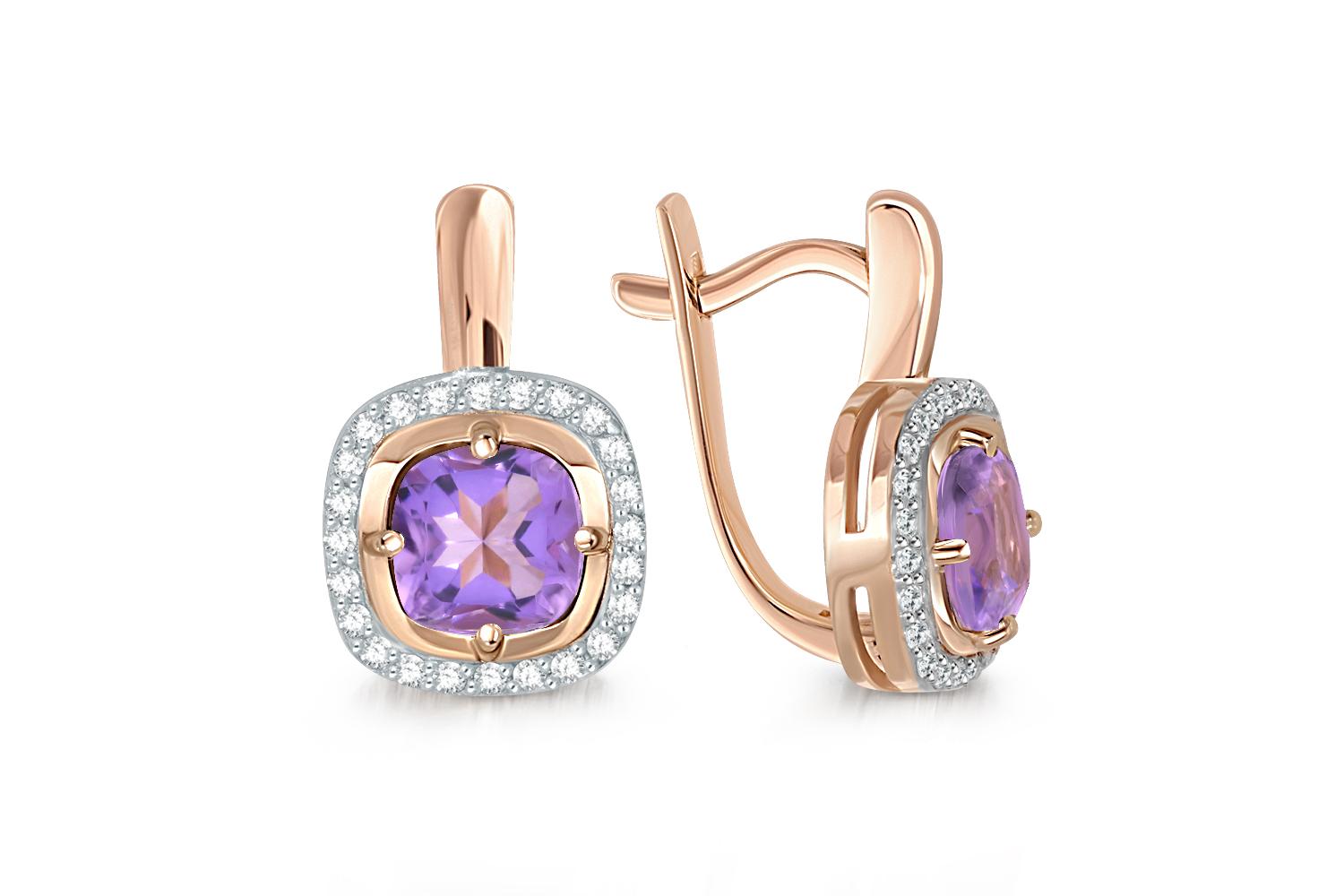 Мастера компании NEWGOLD, приложив всё свое мастерство и искусство, создали для Вас на нашем собственном производстве Серьги из красного золота с 2 аметистами и 48 фианитами.