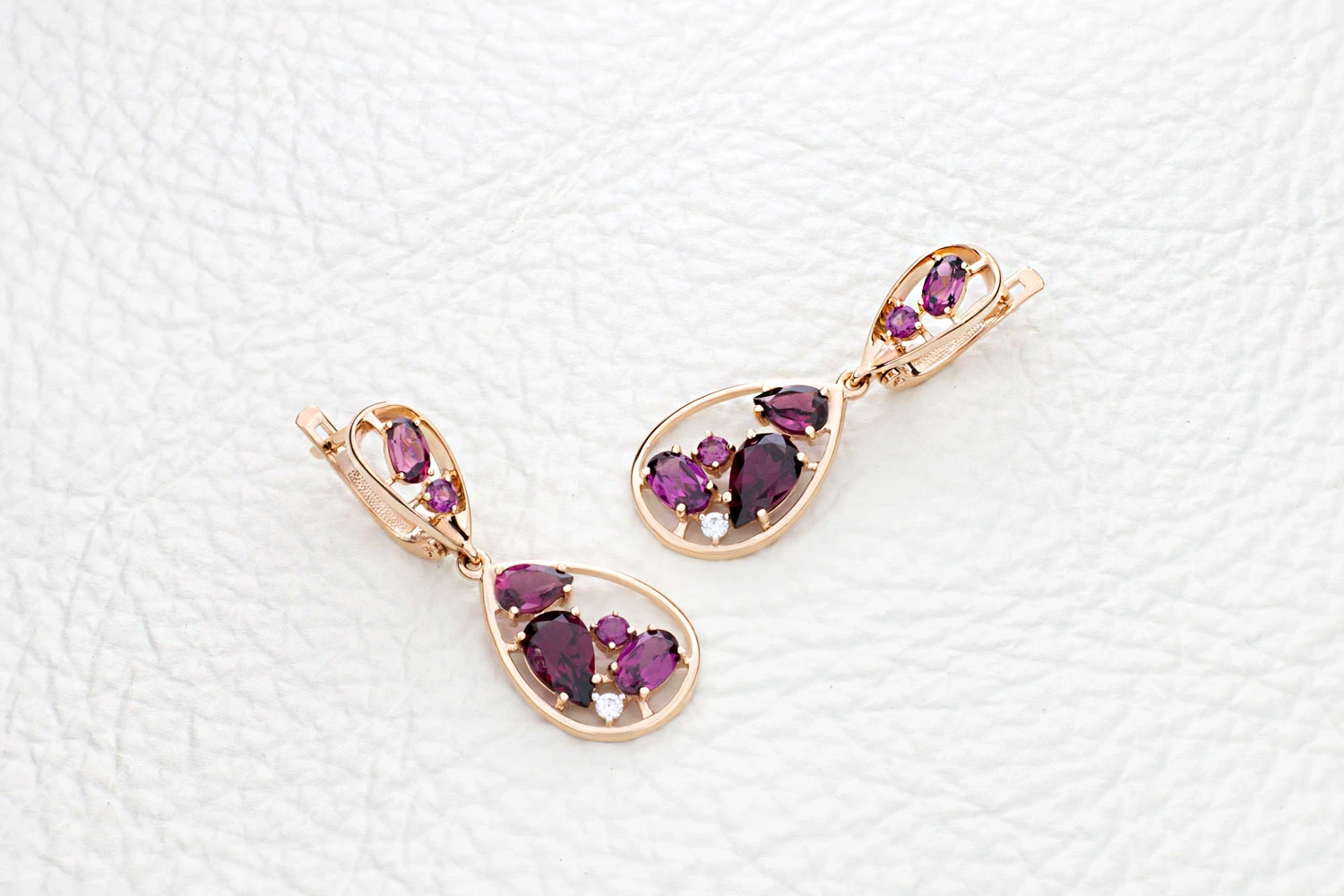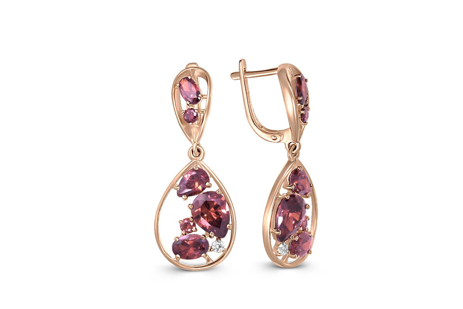 Мастера компании NEWGOLD, приложив всё свое мастерство и искусство, создали для Вас на нашем собственном производстве Серьги из красного золота с 12 родолитами и 2 фианитами.