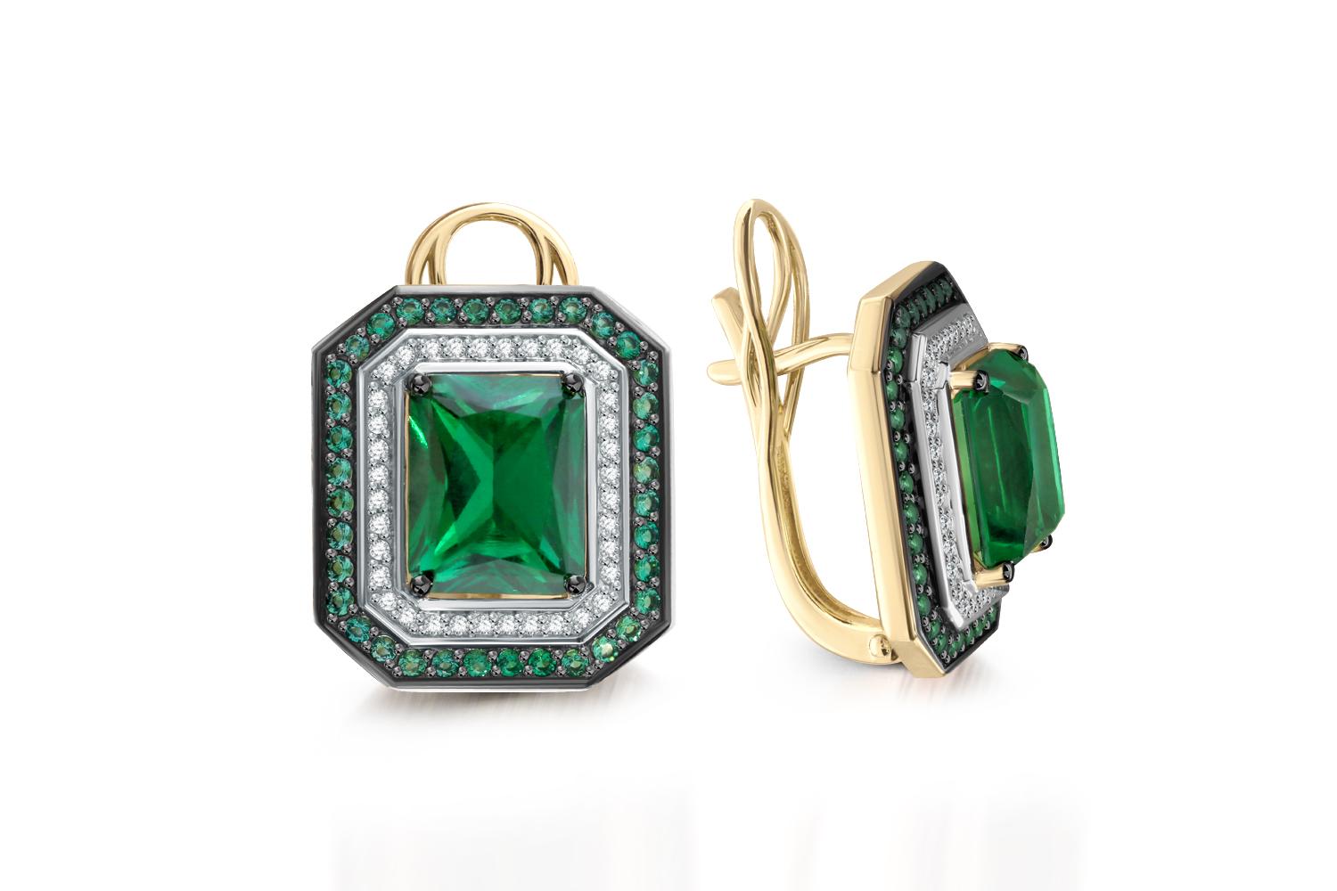 Мастера компании NEWGOLD, приложив всё свое мастерство и искусство, создали для Вас на нашем собственном производстве Серьги из жёлтого золота с 74 изумрудами и 72 бриллиантами.
