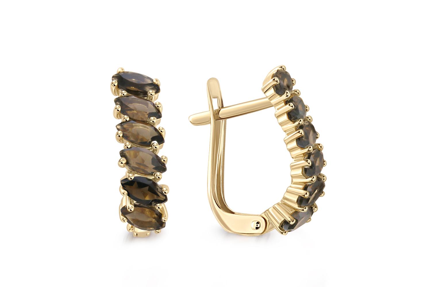 Коллекция: Fresh. Металл: Золото, цвет: Жёлтый , проба: 585. Вставки: Раухтопаз натуральный, количество 12 шт., огранка маркиз, размер 5*2,5. Ювелирные серьги дорожка с Раухтопазом с английским замком. Красивый дымчаты цвет камня притягивает взгляды окружающих. Модель серёг садится на мочку уха правильно и красиво. Благодаря своей неповторимой красоте и игре света, этот камень создает естественное сияние, которое словно волшебной пылью окутывает девушку. Идеальный подарок, подходящий под любой повод: вечеринку, отпуск, пляжный отдых, День рождения, 8 марта, Новый год, 14 февраля День Святого Валентина, День Всех Влюбленных, Рождество, помолвку, свадьбу и любое важное событие для Вас и ваших близких и родных. Так же не забывайте подписываться на наш бренд , чтобы быть в курсе наших акций.Приятных покупок!!! С уважением команда NEWGOLD.