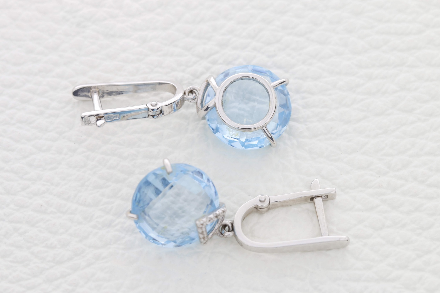 Мастера компании NEWGOLD, приложив всё свое мастерство и искусство, создали для Вас на нашем собственном производстве Серьги из белого золота с 2 топазами sky и 10 фианитами.