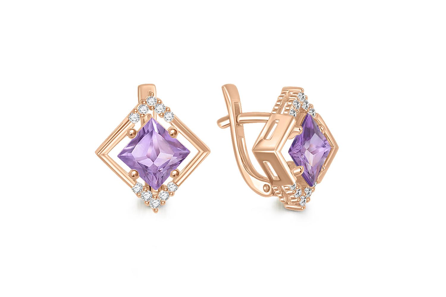Мастера компании NEWGOLD, приложив всё свое мастерство и искусство, создали для Вас на нашем собственном производстве Серьги Квадраты из красного золота с 2 аметистами и 20 фианитами.