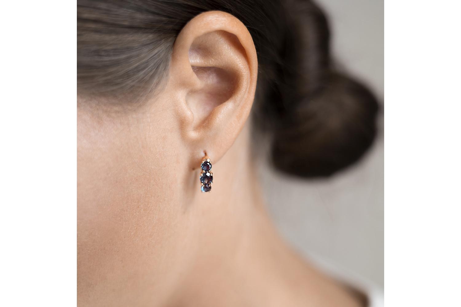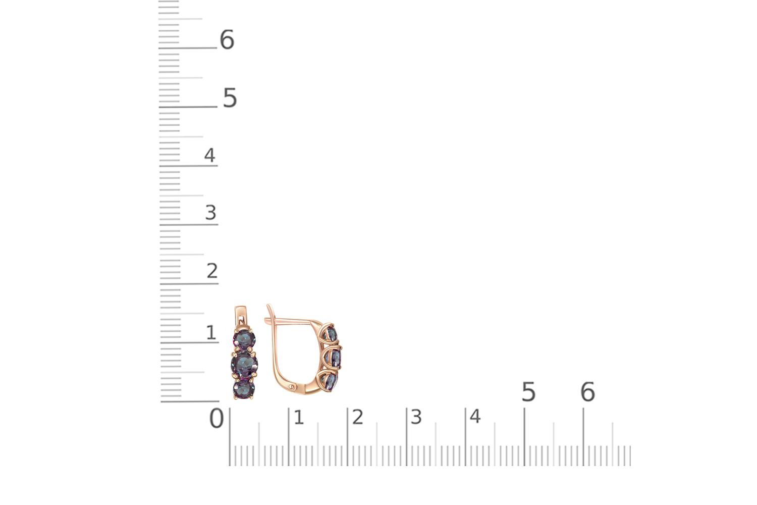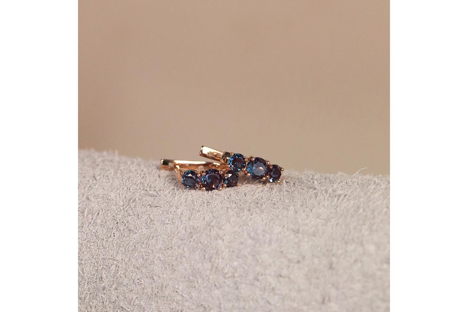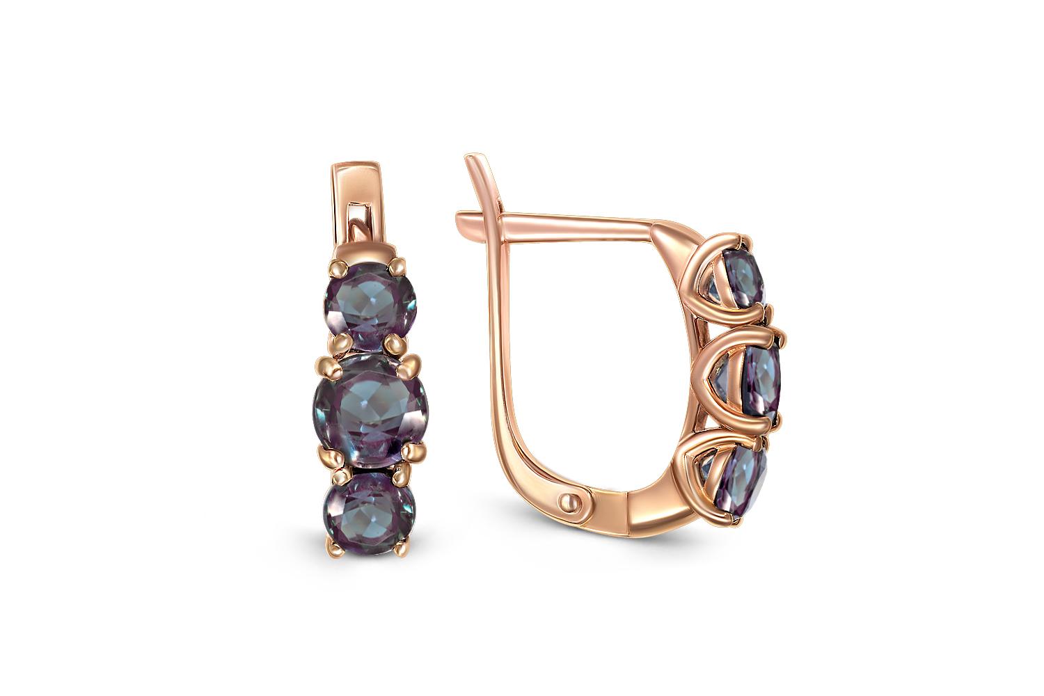 Изысканные серьги из розового золота 585 пробы, украшенные тремя александритами насыщенного сине-зелёного оттенка. Драгоценные камни плавно переливаются от сизо-фиолетового до изумрудно-зелёного цвета в зависимости от освещения - характерная особенность александритов.