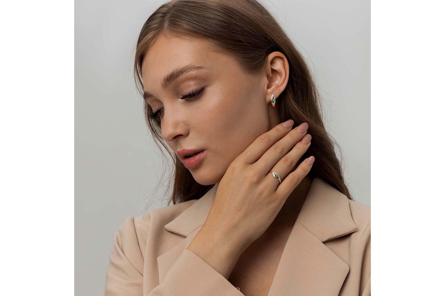 Замок серег классический английский - с надежным фиксатором, что обеспечивает комфортное и безопасное ношение. Игра света на гранях изумрудов и бриллиантов создает впечатление живого, трепетного украшения. Цветовое решение - нежное и элегантное: теплый розовый тон золота контрастирует с холодным блеском белых вставок, а изумруды добавляют глубины и насыщенности всей композиции.