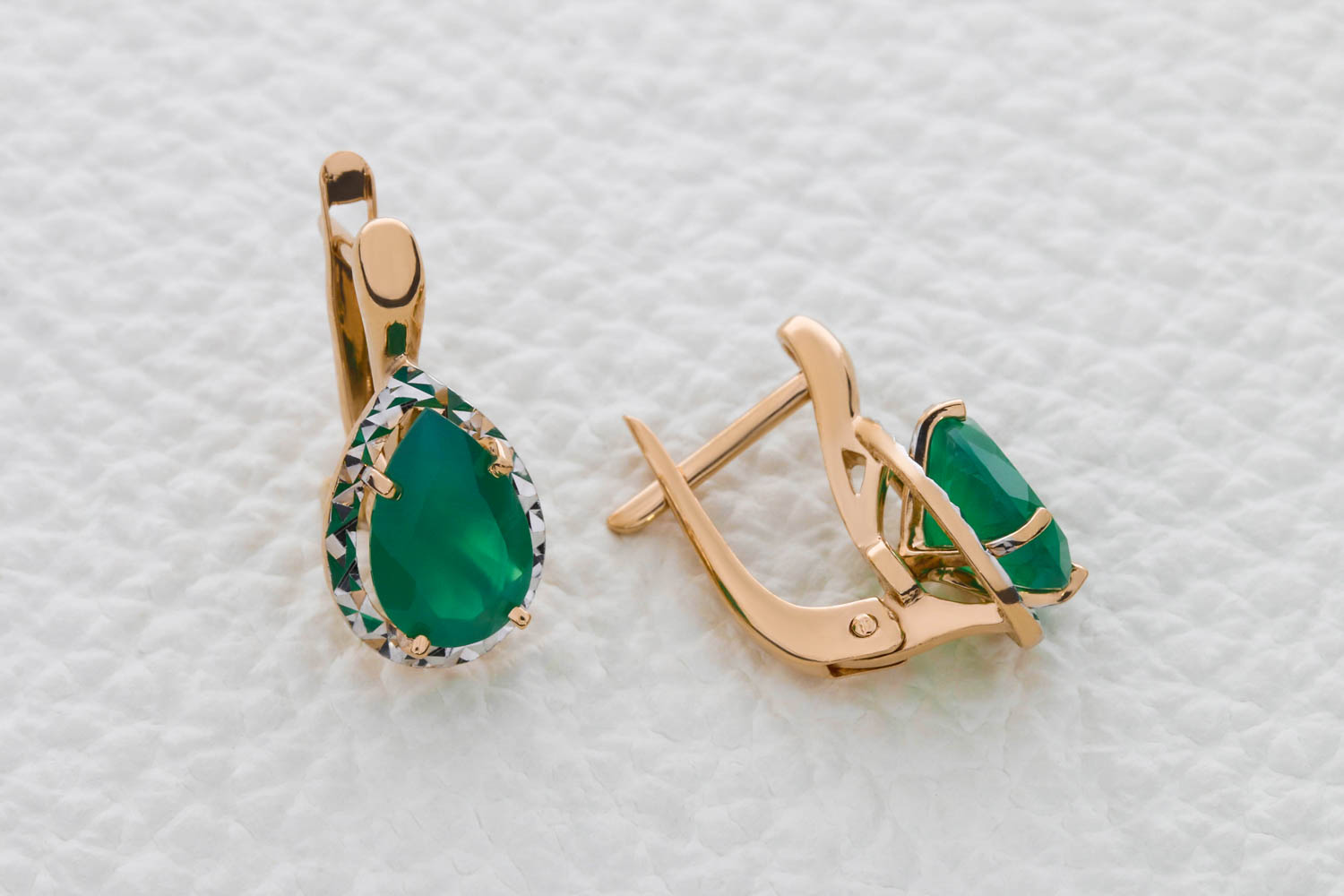 Коллекция "Антик" Агат зеленый, количество 2 шт. , огранка груша, размер 9ˣ6 Серьги из золота 585 пробы с английским надежным замком бренда NEWGOLD. Ювелирные серьги прекрасно подайдут даже тем,у кого низко сделан прокол, за счет центральной выступающей верхней части прокол закрывается, тем самым садится на мочке уха идеально. ( смотри фото на модели).