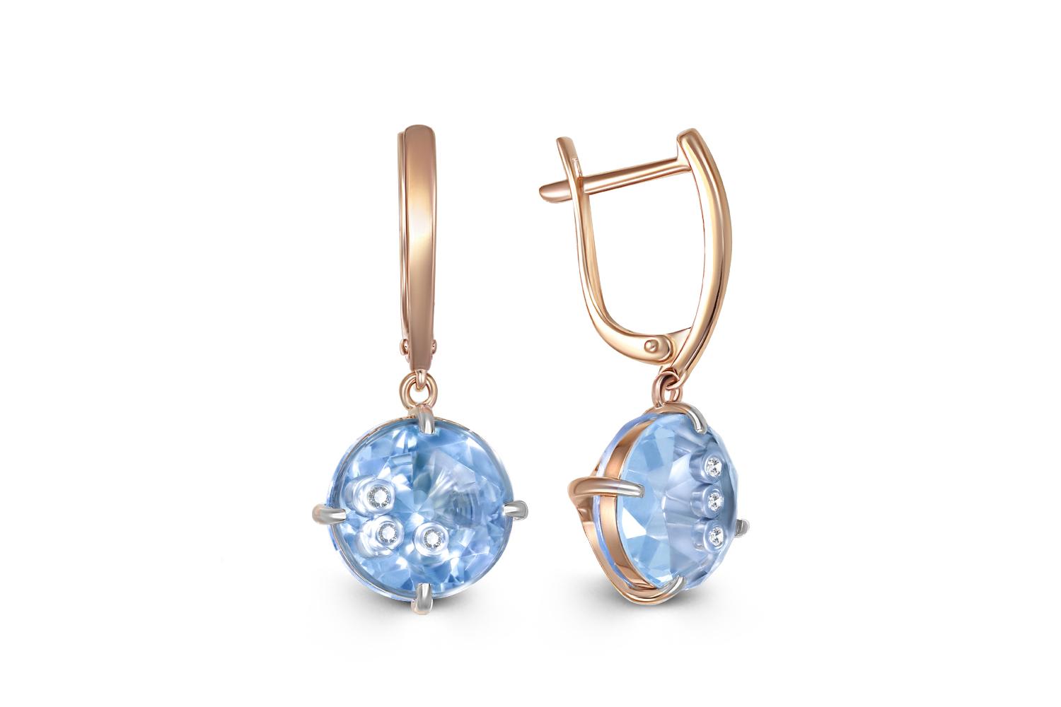Мастера компании NEWGOLD, приложив всё свое мастерство и искусство, создали для Вас на нашем собственном производстве Серьги из красного золота с 4 топазами sky и 6 бриллиантами.