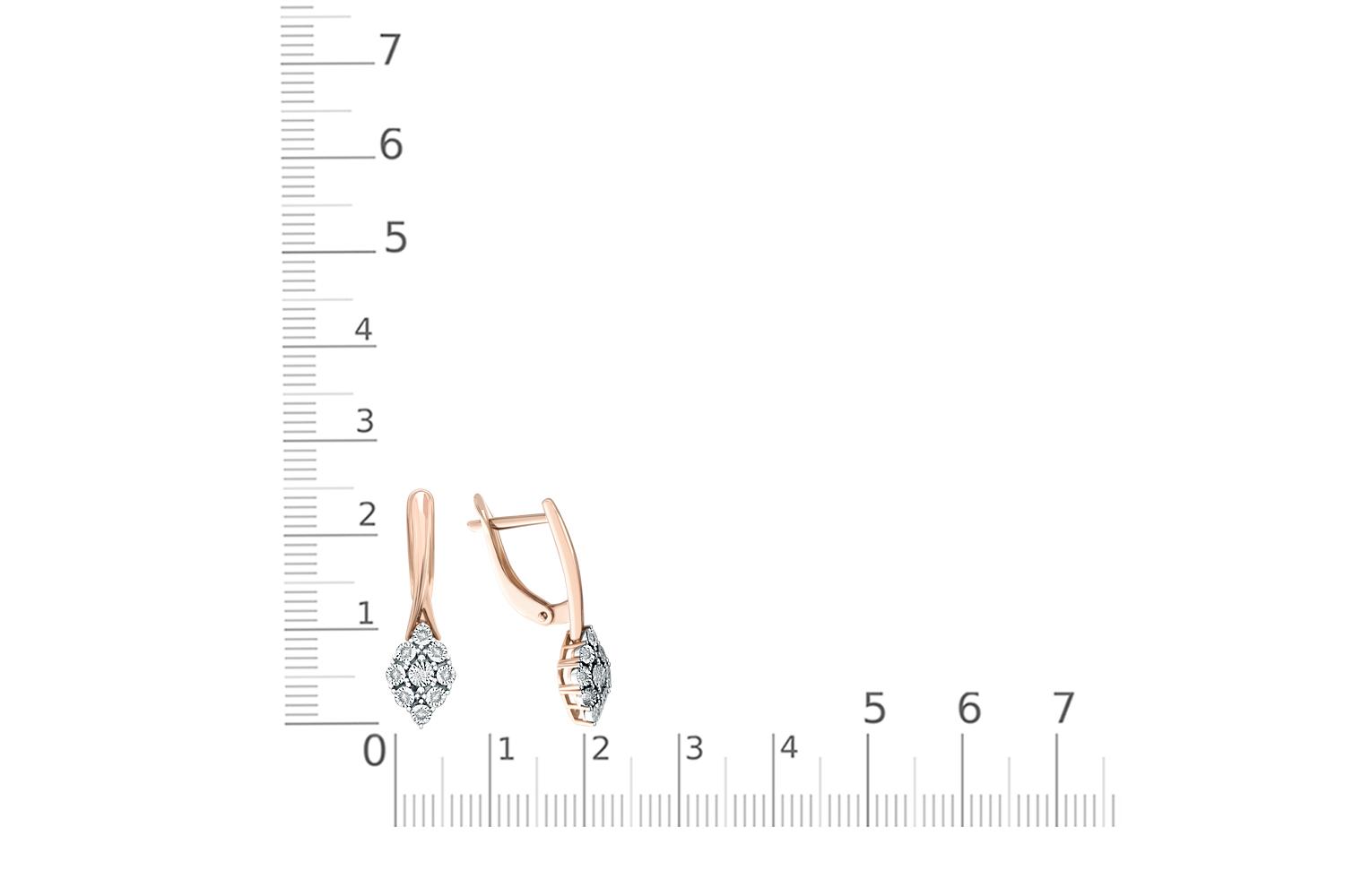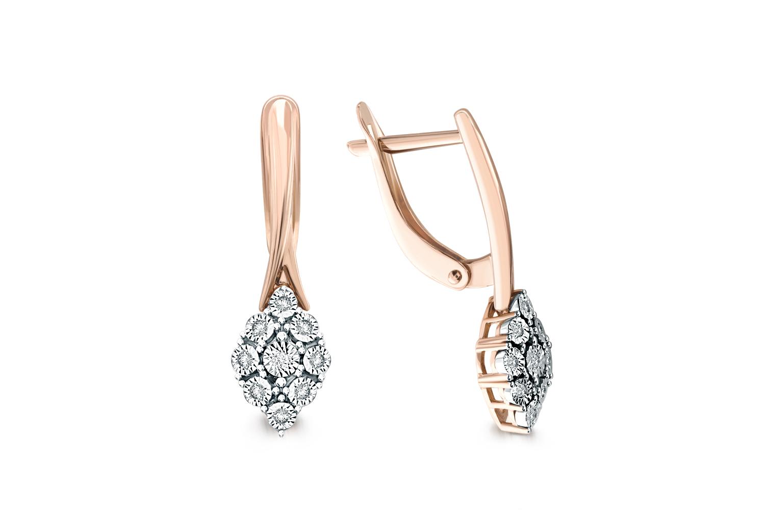 Металл: Золото, цвет: Красный/Белый , проба: 585. Вставки: Бриллиант, количество 2 шт. , огранка Кр-57, размер 1 мм, цвет 4, чистота 4 ; Бриллиант, количество 16 шт. , огранка Кр-17, размер 0,9 мм, цвет 2, чистота 2.